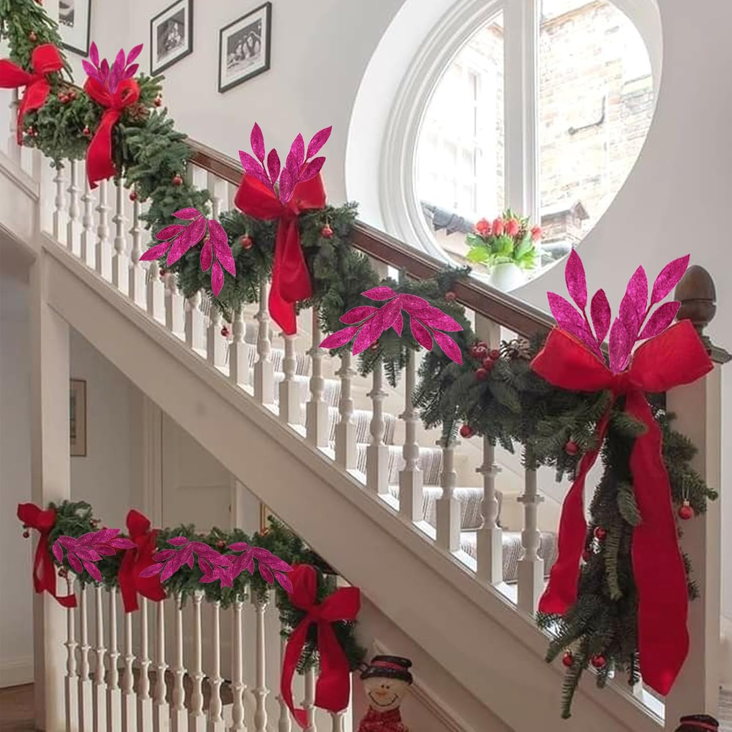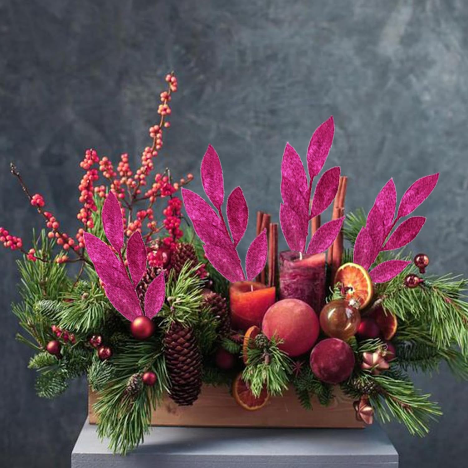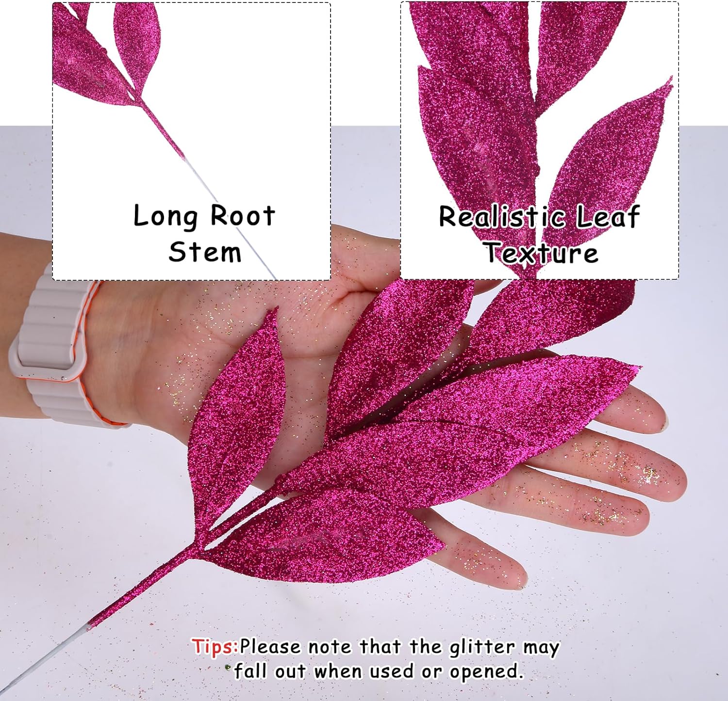 GREENTIME 12 Pack Artificial Rose Red Glitter Leaves 13" Fake Christmas Picks Decorative Glitter Sticks for Vase Christmas Tree DIY Wreath Crafts Fireplace Decor
