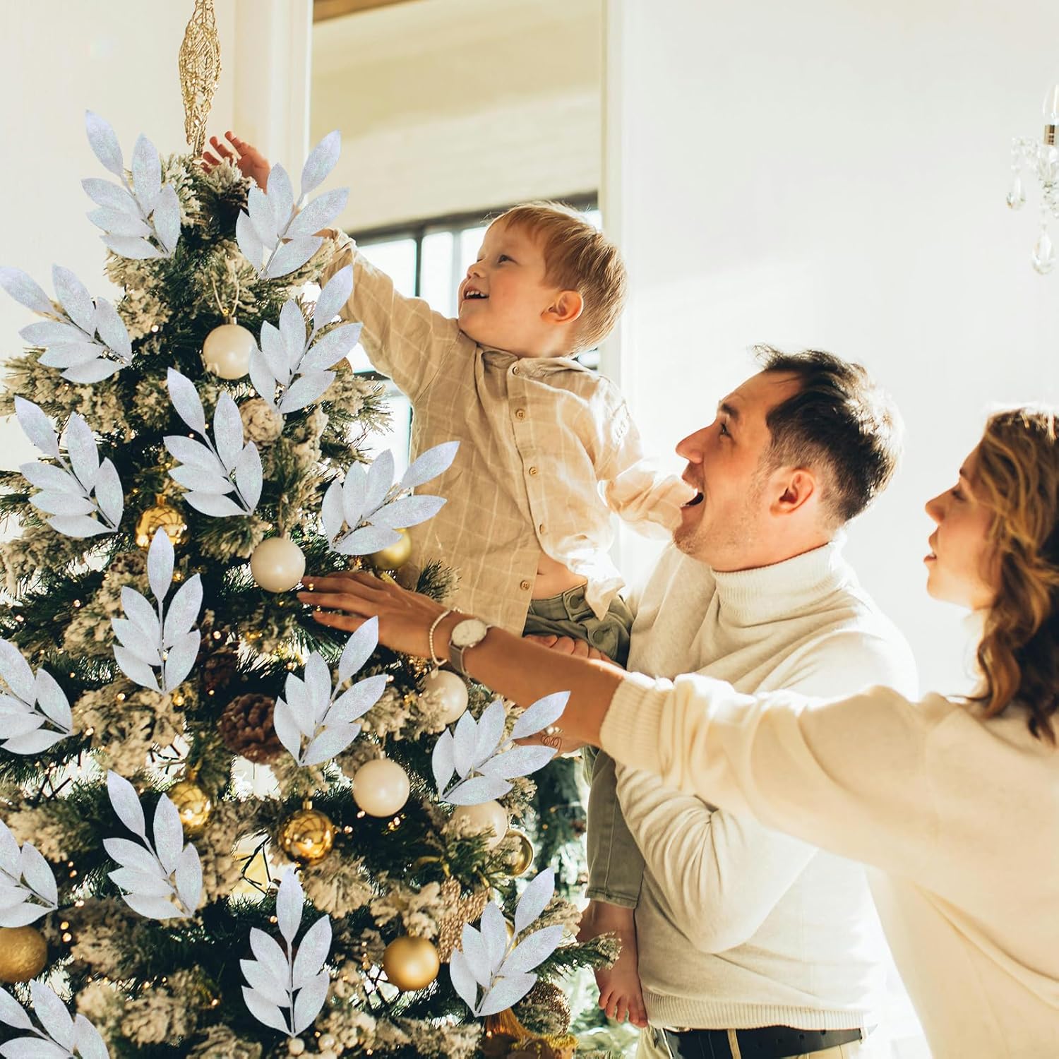 GREENTIME 12 Pack Artificial White Glitter Leaves 13" Fake Christmas Picks Decorative Glitter Sticks for Vase Christmas Tree DIY Wreath Crafts Fireplace Decor