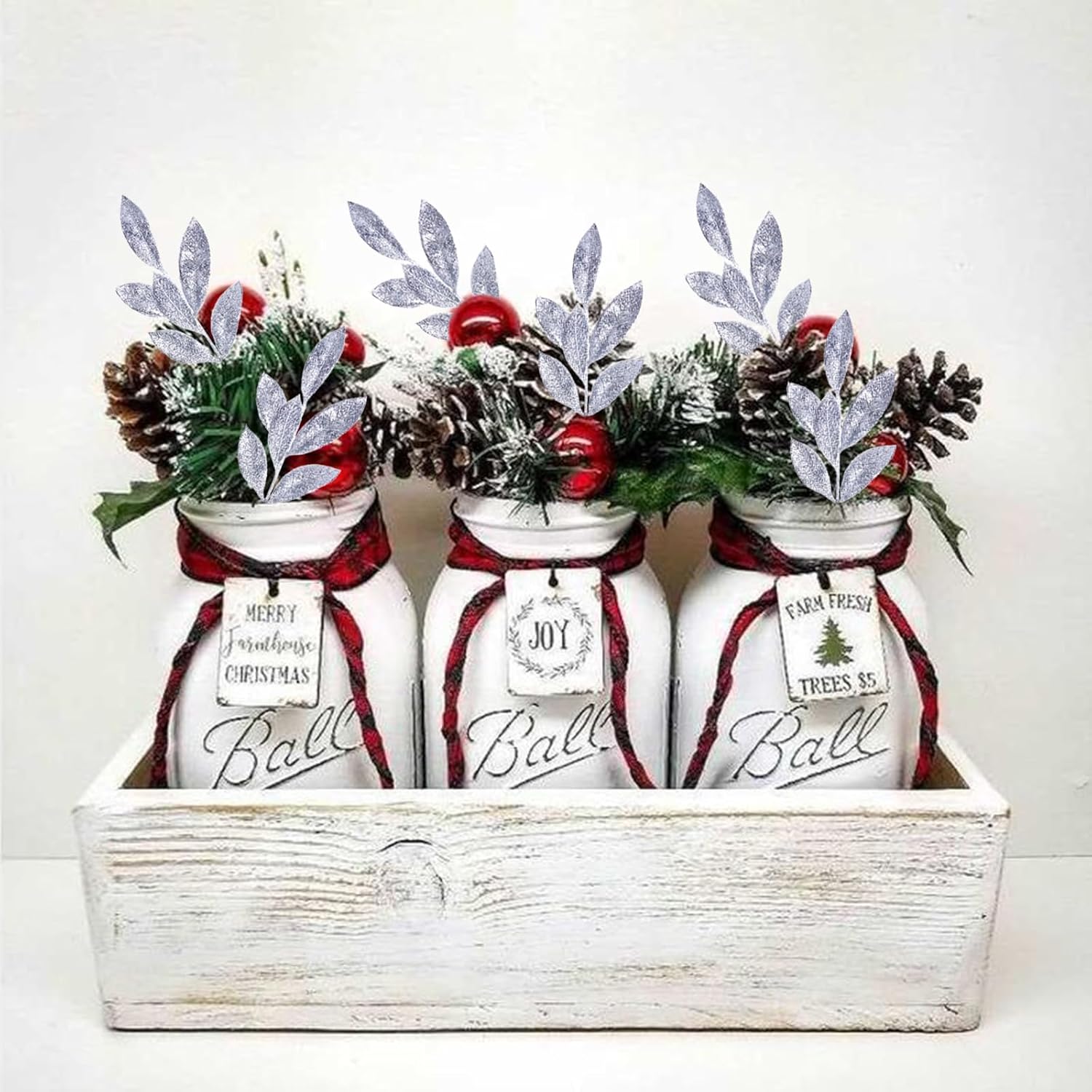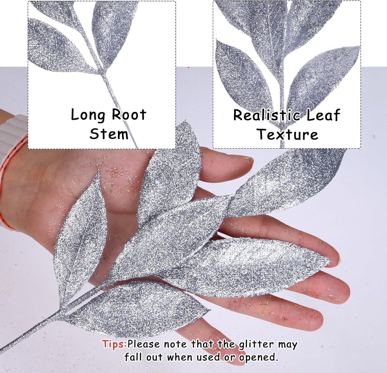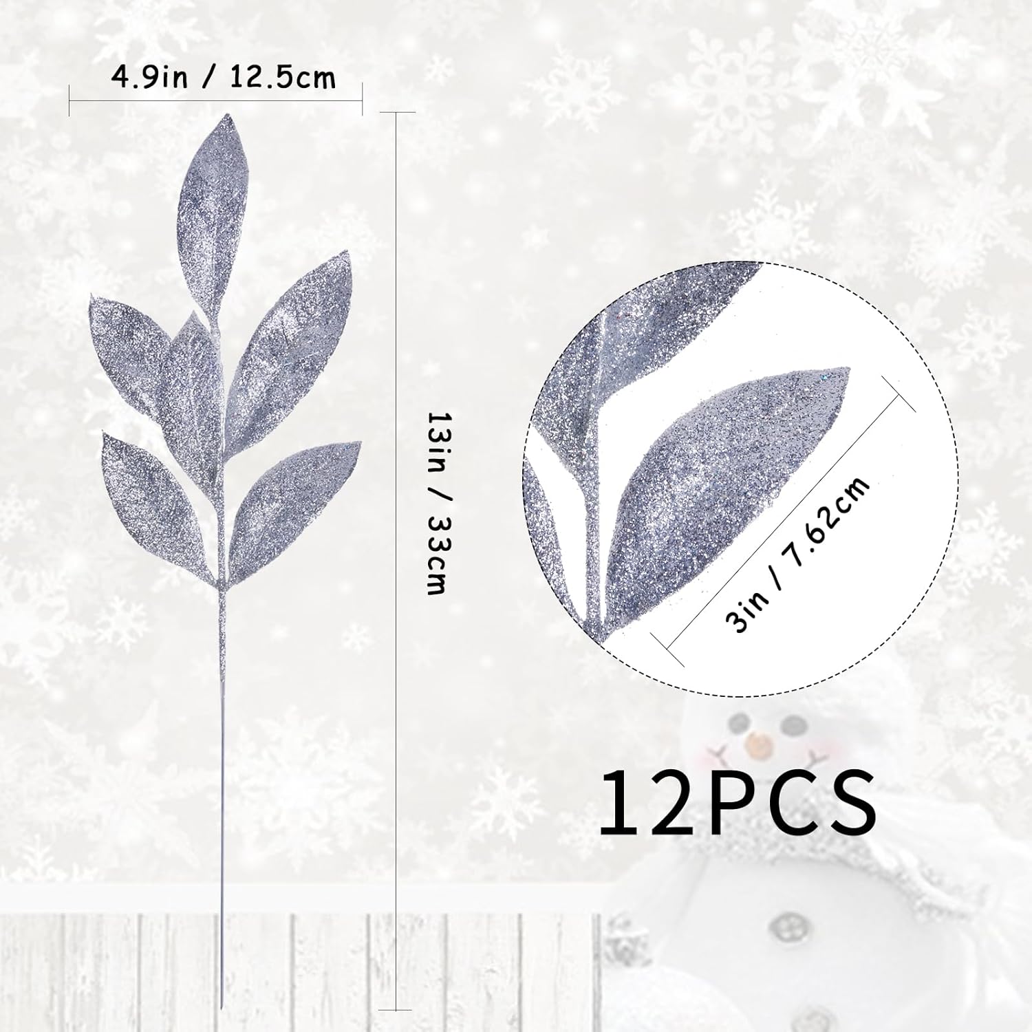 GREENTIME 12 Pack Artificial Silver Glitter Leaves 13" Fake Christmas Picks Decorative Glitter Sticks for Vase Christmas Tree DIY Wreath Crafts Fireplace Decor