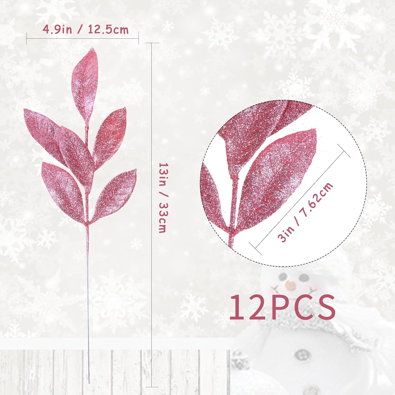 GREENTIME 12 Pack Artificial Pink Glitter Leaves 13" Fake Christmas Picks Decorative Glitter Sticks for Vase Christmas Tree DIY Wreath Crafts Fireplace Decor