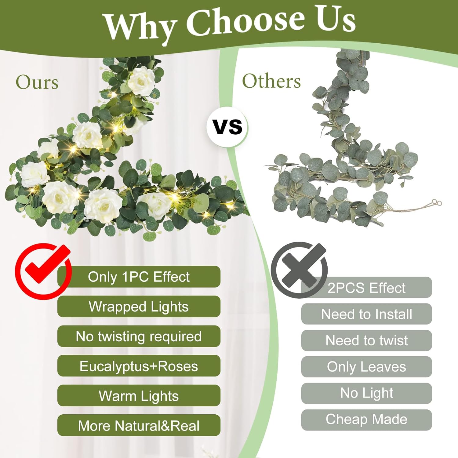 • Eucalyptus Garland with Built-in LED Lights: Transform any space into a magical setting with our 6.6FT eucalyptus garland, now upgraded with built-in led lights! Whether decorating a wedding arch, table centerpiece, fireplace mantel, backdrop, or outdoor garden fence, this rose flower garland brings timeless elegance and a touch of romance to any occasion. The versatile design allows for endless creative possibilities, making it perfect for weddings, Valentines Day, Mothers Day or seasonal celebrations