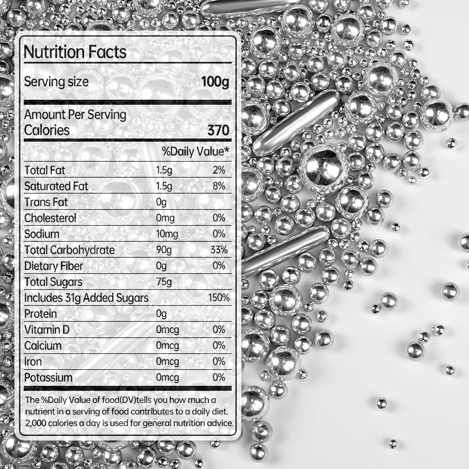 • Silver Pearl Rods Sprinkles are made from premium food-safe ingredients. These sprinkles not only look great but are also Food Grade. Net Weight: 150g/5.29oz. You can use them with confidence, because they are made from food-safe materials and are gluten-free, nut-free, preservative-free, dairy-free, chemical-free and non-GMO.