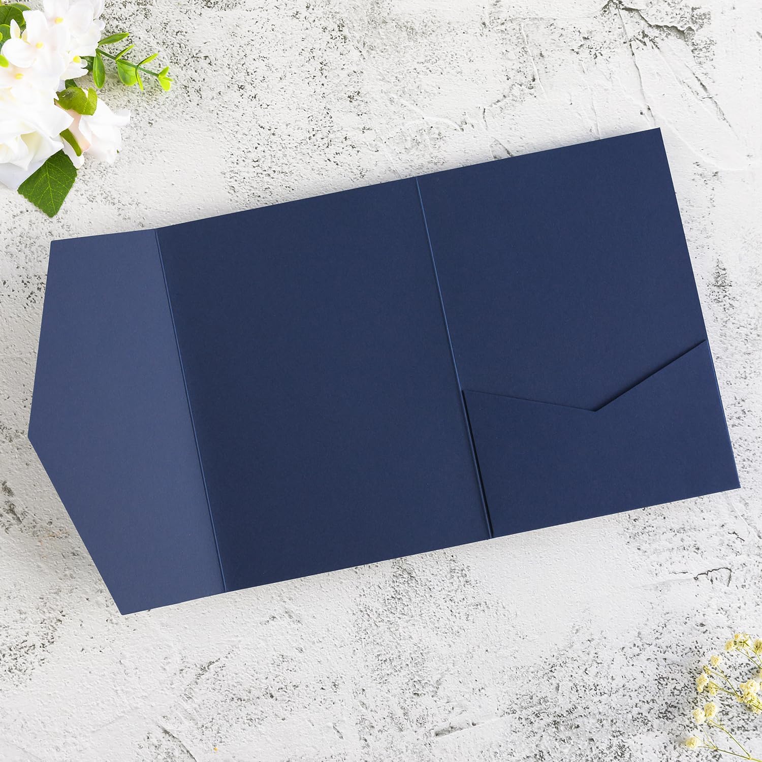 • HIGH QUALITY -- The navy blue tri-fold invitation pockect is made from 250 gsm thick paper, Very good quality and heavy, not easily deformed, Look simple and elegant