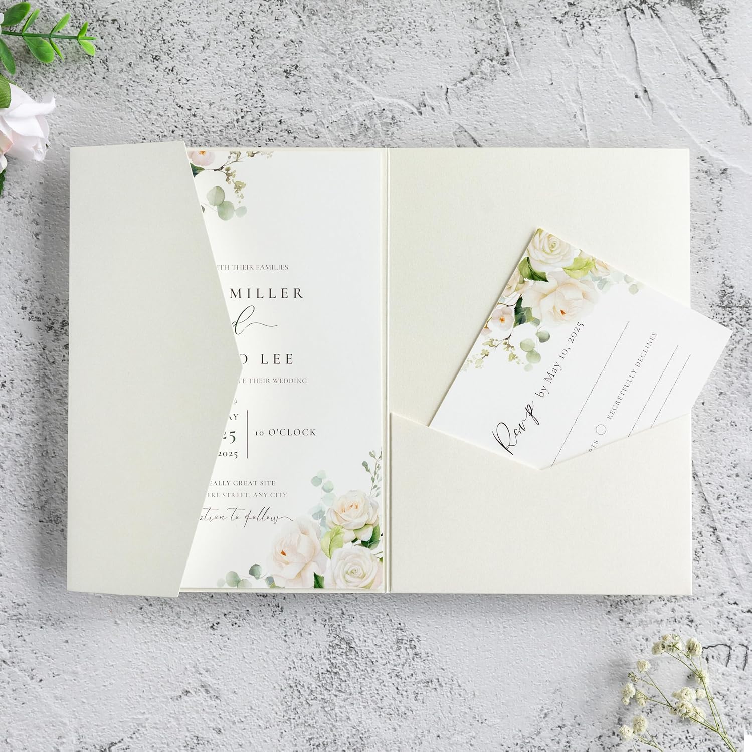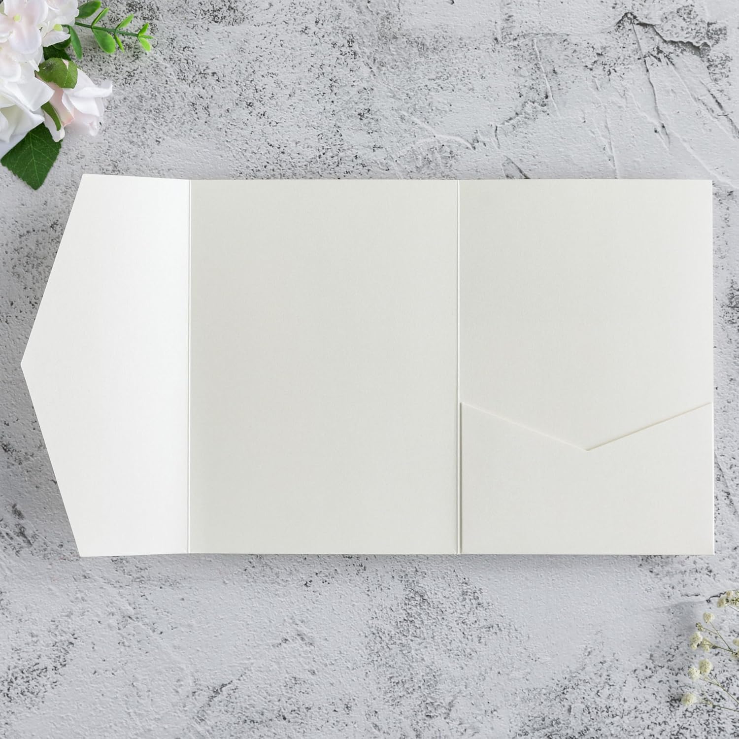 • HIGH QUALITY -- The ivory tri-fold invitation pockect is made from 250 gsm pearl paper, Very good quality and heavy, not easily deformed, Look simple and elegant.