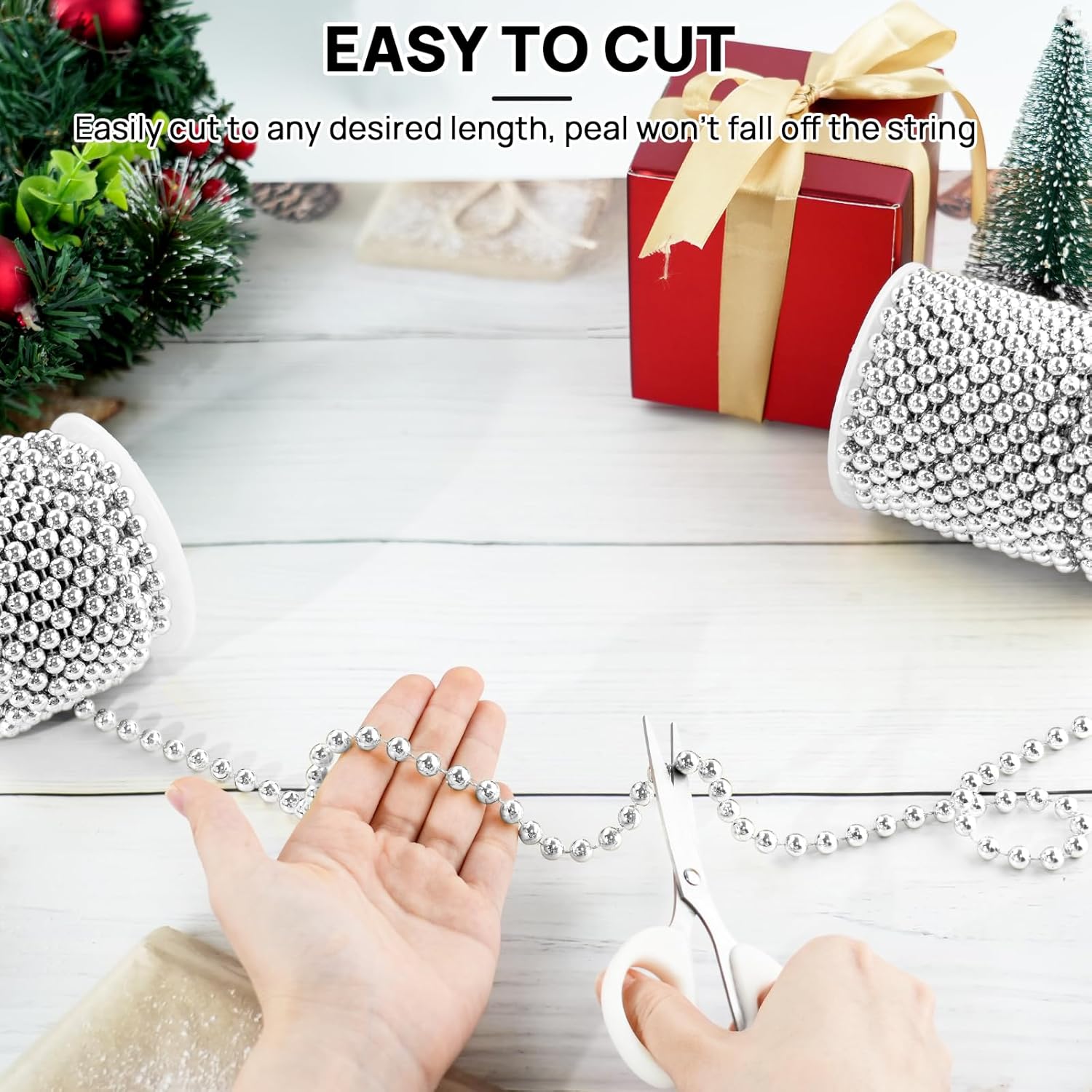Craft String Pearls 8MM Pearl Bead, 33 Feet Silver Faux Pearl Garland Spool Roll Strand Wedding Party Decoration, Christmas Tree Decorations