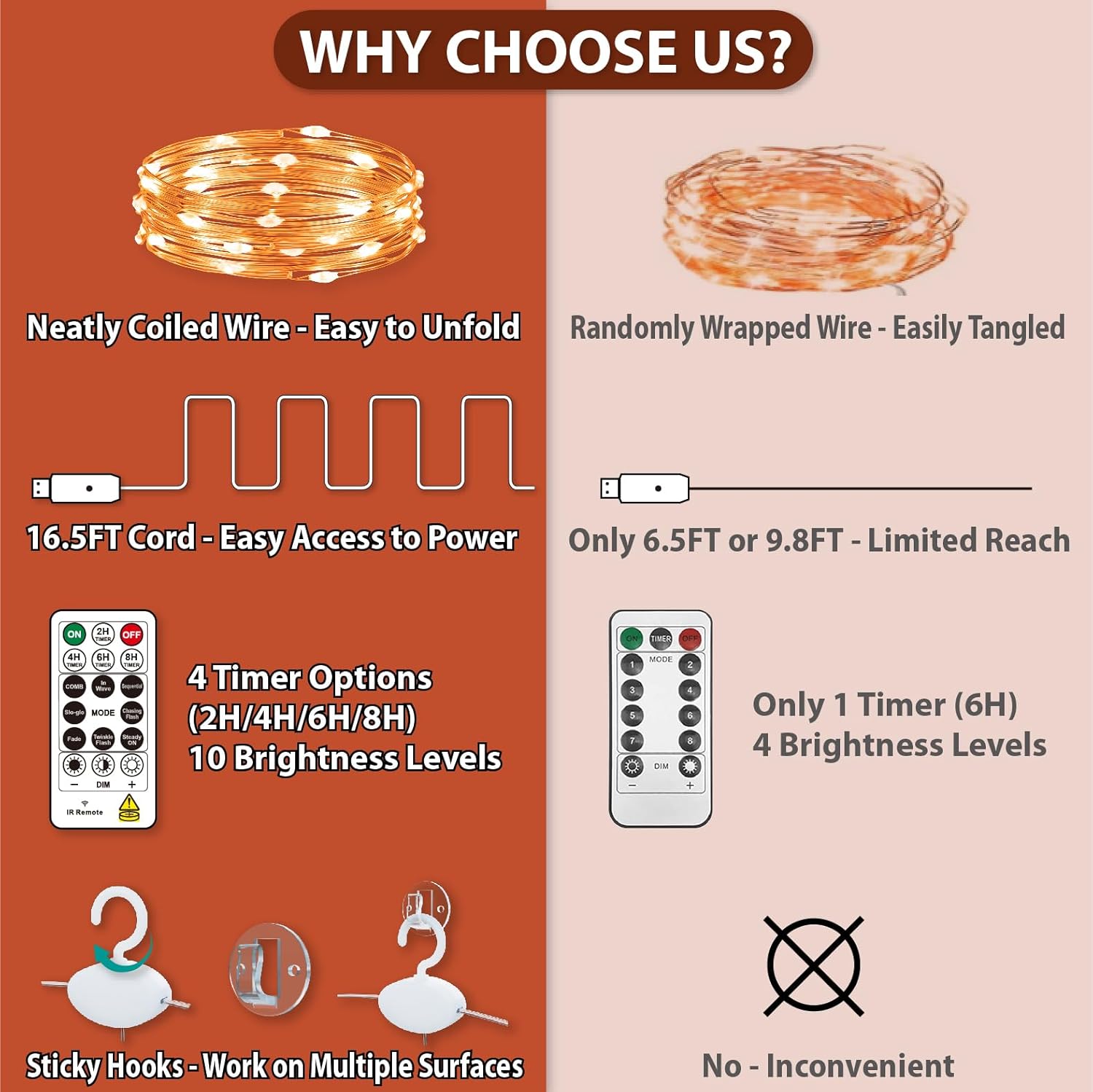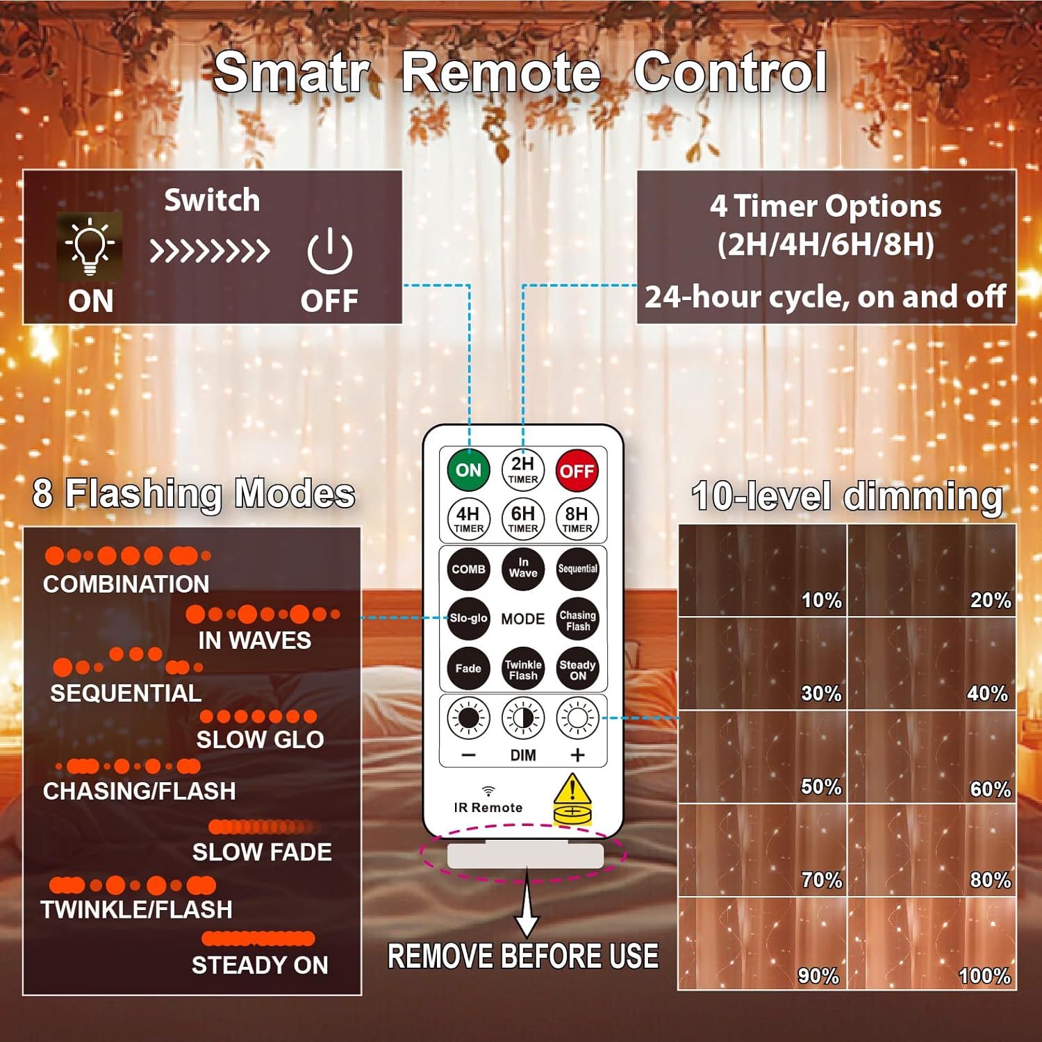 • 8 Light Settings & Timer Remote: Unlike others, our 17-Keys remote added 4 timing modes (2/4/6/8 hours on, 22/20/18/16 hours off). 8 different flash modes to choose from, and you can adjust the brightness of the lights by pressing "dim" ,“+” and "-". That are all controlled easily by a wireless remote at 10~15 meters, aim at the USB receiving direction when you press. All is in your control