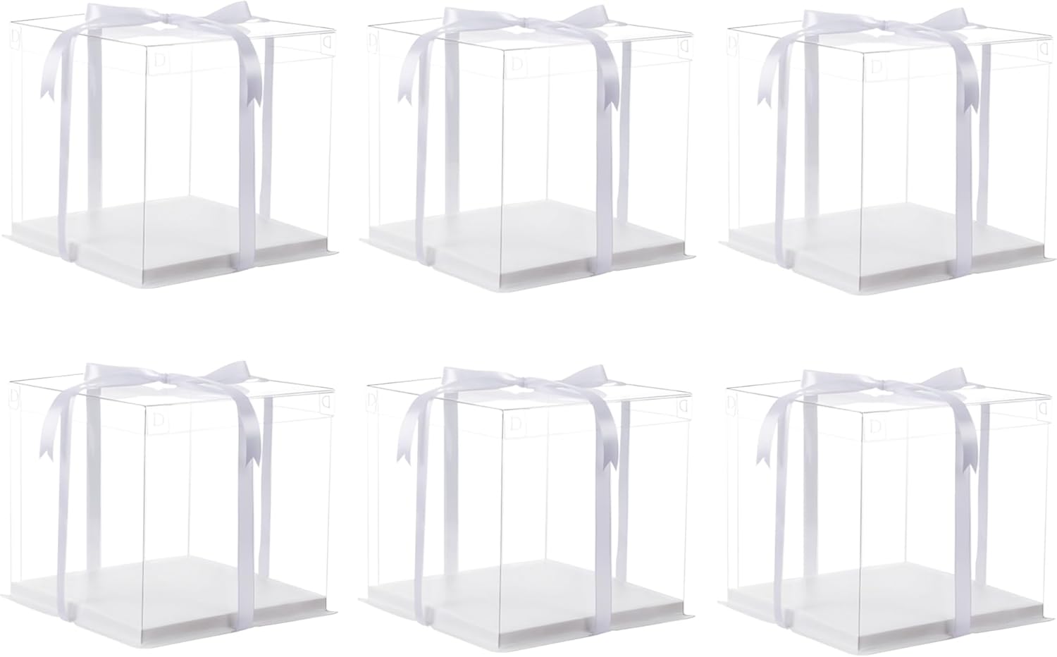 • 【Size and material】-The product includes 6 transparent cake boxes with A roll of white ribbon. Box size: 14"x14"x10", suitable for 10inch or 12inch cakes and gift packaging. Made of cardboard and PET materials, safe and durable. The top and middle part of the cake box are transparent, and the cake box bottom tray is white
