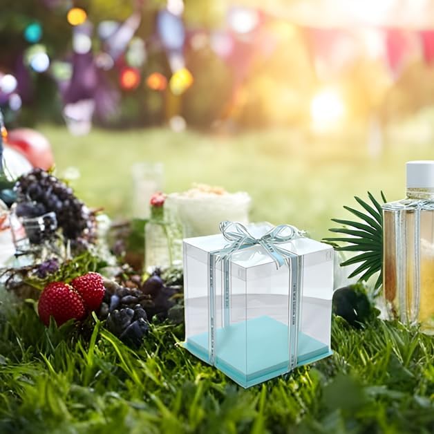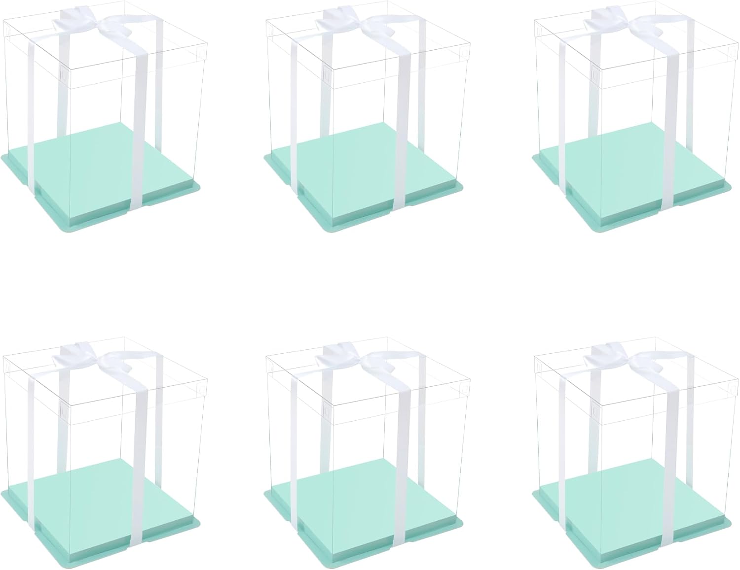 • 【Size and material】-The product includes 6 transparent cake boxes with a roll of white ribbon. Cake Box size: 7"x7"x8", suitable for cakes and gift packaging. The cake boses made of cardboard and PET materials, safe and durable. The top and middle part of the cake box are transparent, and the bottom covers is white