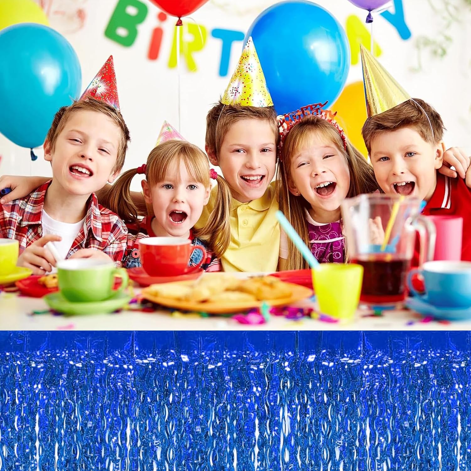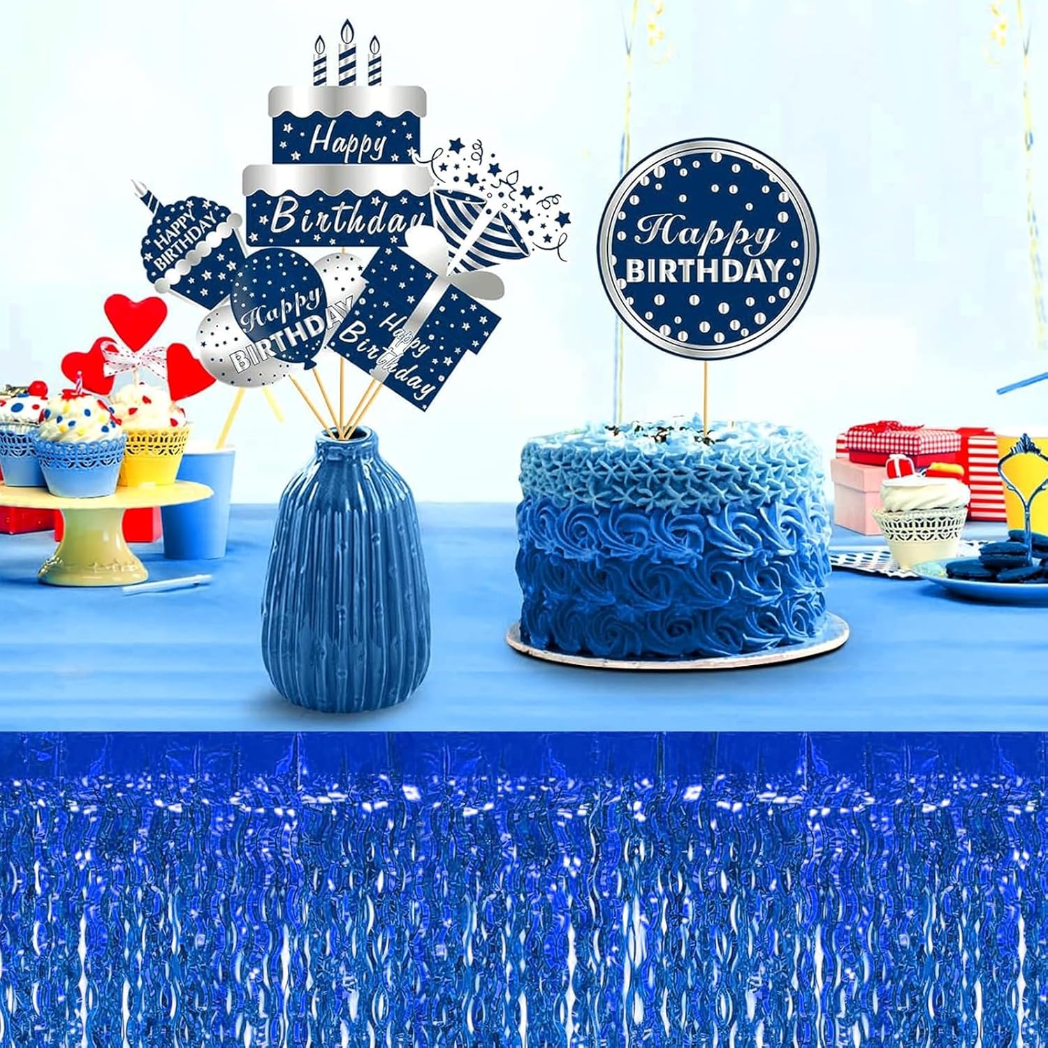 4P Wavy Metallic Tinsel Foil Fringe Table Skirts for Rectangle Tables Backdrop Garland Curtains for Parade Floats Wedding Birthday Parties Decoration Graduation 2025 Christmas (Blue)