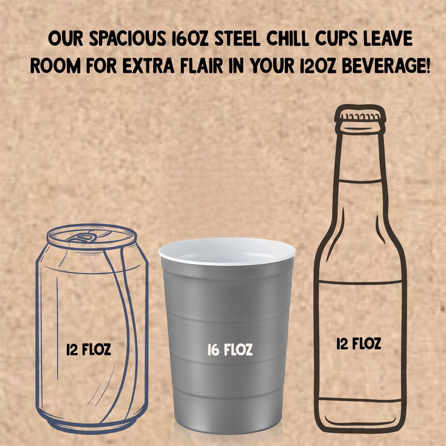 • Versatile Party Cup: Whether sipping iced coffee, enjoying a beer, or mixing up some cocktails, Steel Chill Cups are ready with a trendy and sleek metal look, which fits into any party theme or kitchen set