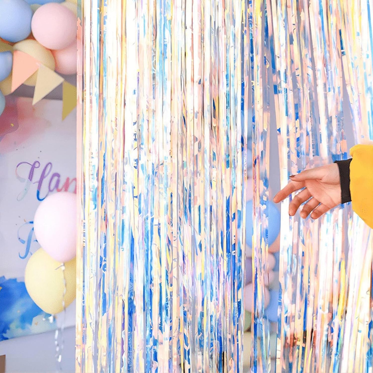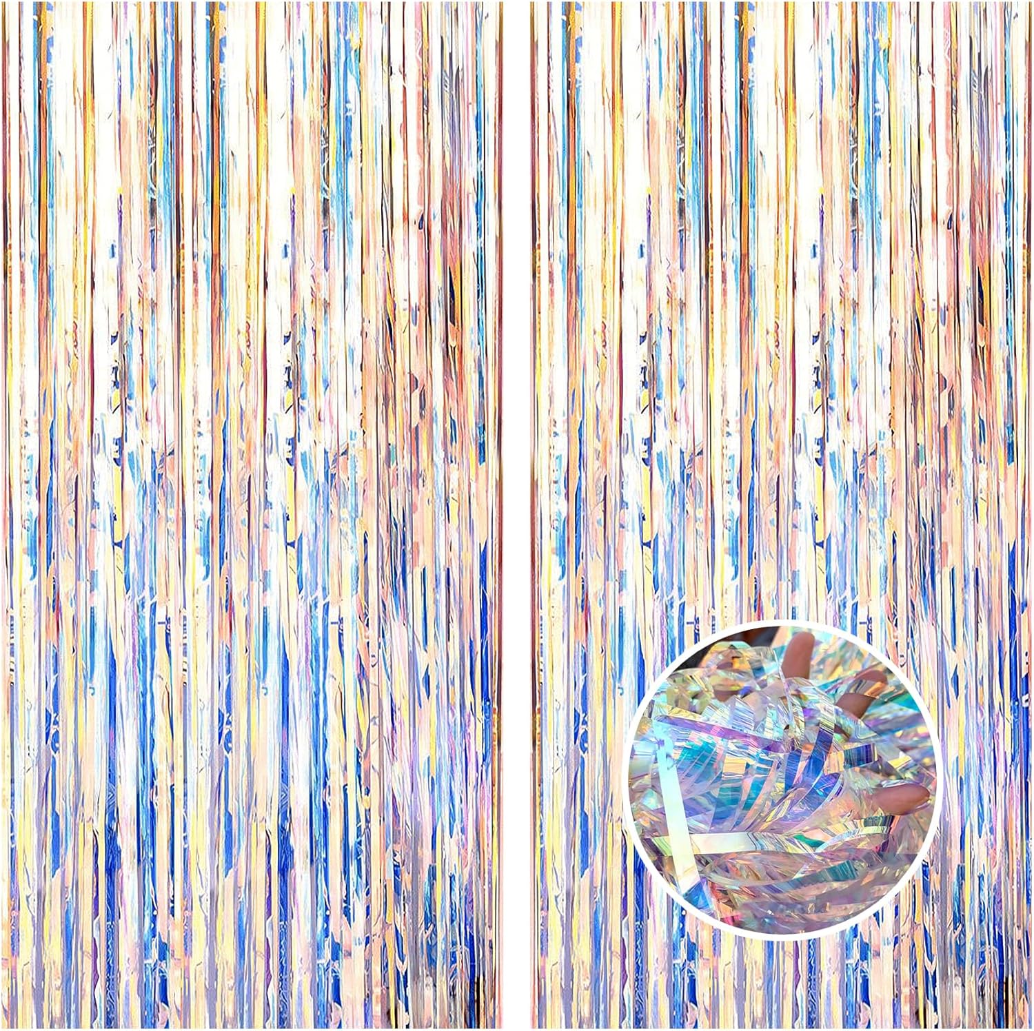 CANREVEL 2 Pack 3.2x6.5 Feet Iridescent Foil Fringe Backdrop Curtains, Neon Transparent Holographic Tinsel Streamers Party Decorations for Mermaid/Frozen/Sea/Euphoria/ERAS Party
