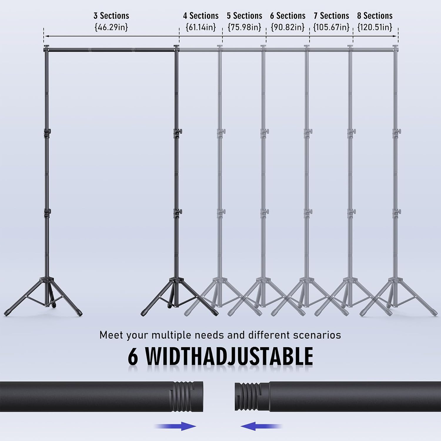• 6 Widths Available Backdrop Stand: Suitable for a wider range of background sizes and party dressing as there are 6 sizes of widths to choose from, unlike traditional backdrop stands, our back drop stand has 8 crossbars with 6 different widths to choose from