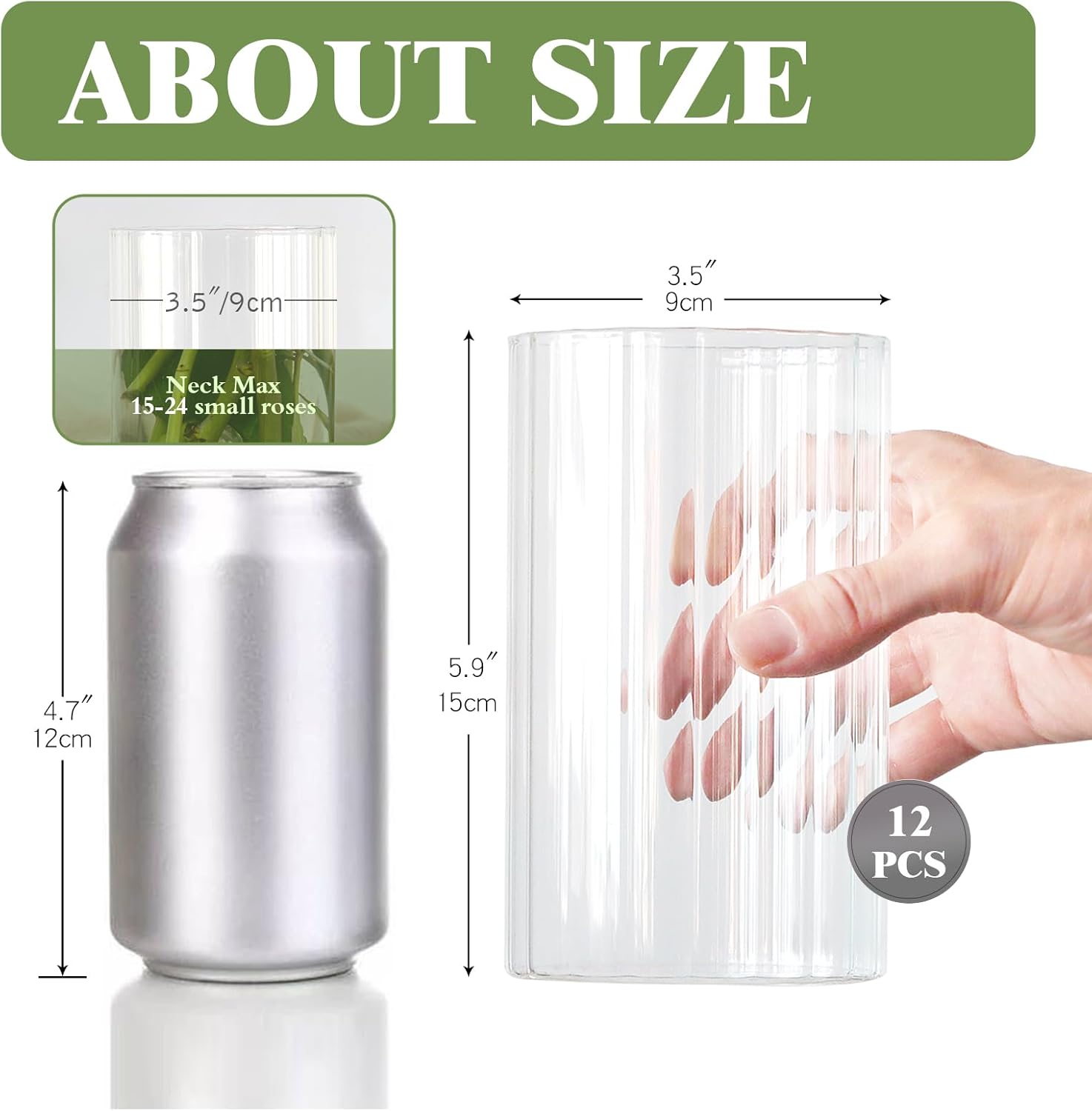 • 【Package Including】You will get 12 pack ribbed glass vases with a diameter of 3.5'' and 5.9'' tall.providing an ideal size for floral arrangements/home decor/ hurricane candle holder.
