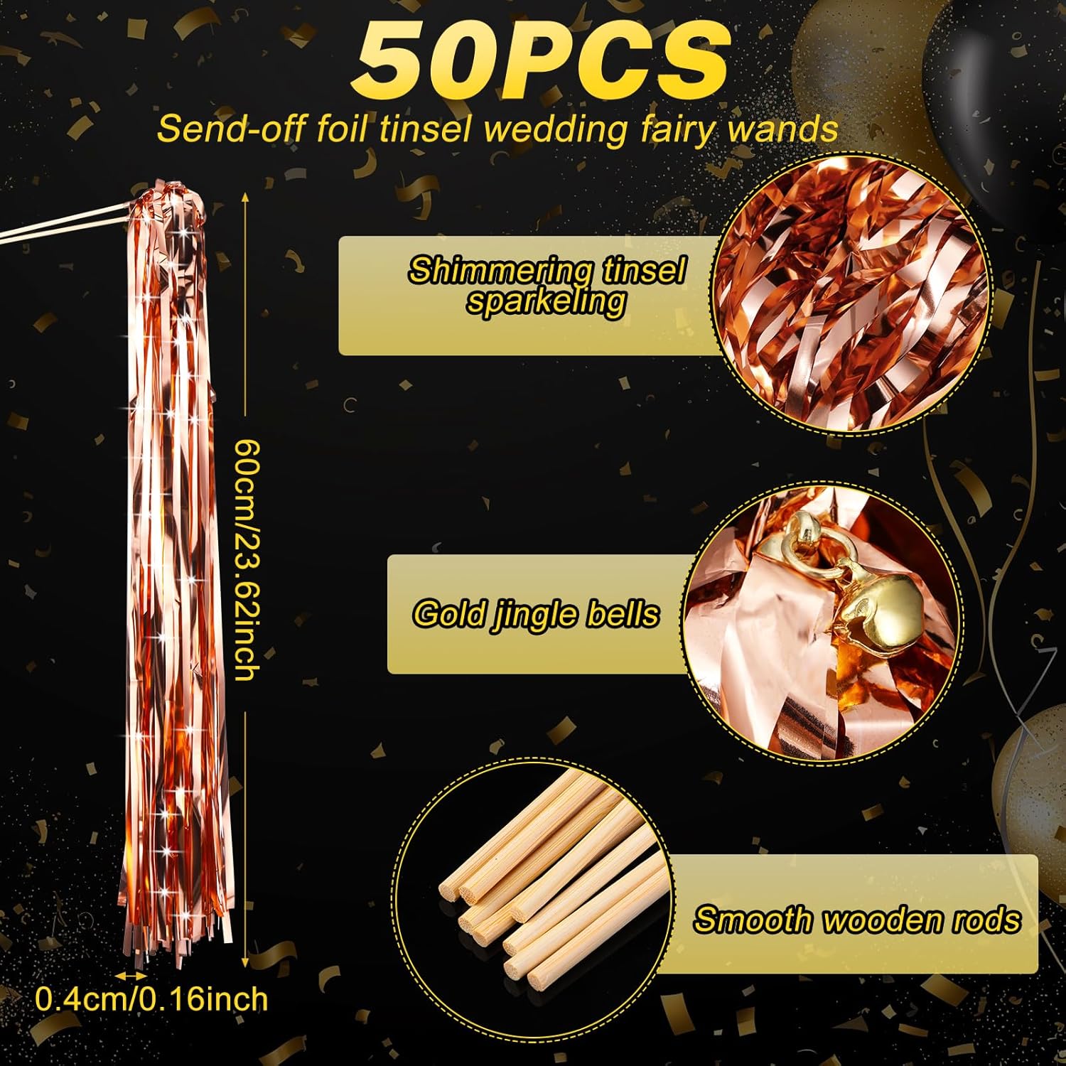 • Ideal Size: the size of the wedding wands is about 11.8 x 0.2 inches/ 30 x 0.5 cm for the stick and 23.6 x 0.2 inches/ 60 x 0.4 cm for the metallic foil; The stick is designed to be comfortably held in hands while the metallic foil is long enough for a dramatic and festive effect