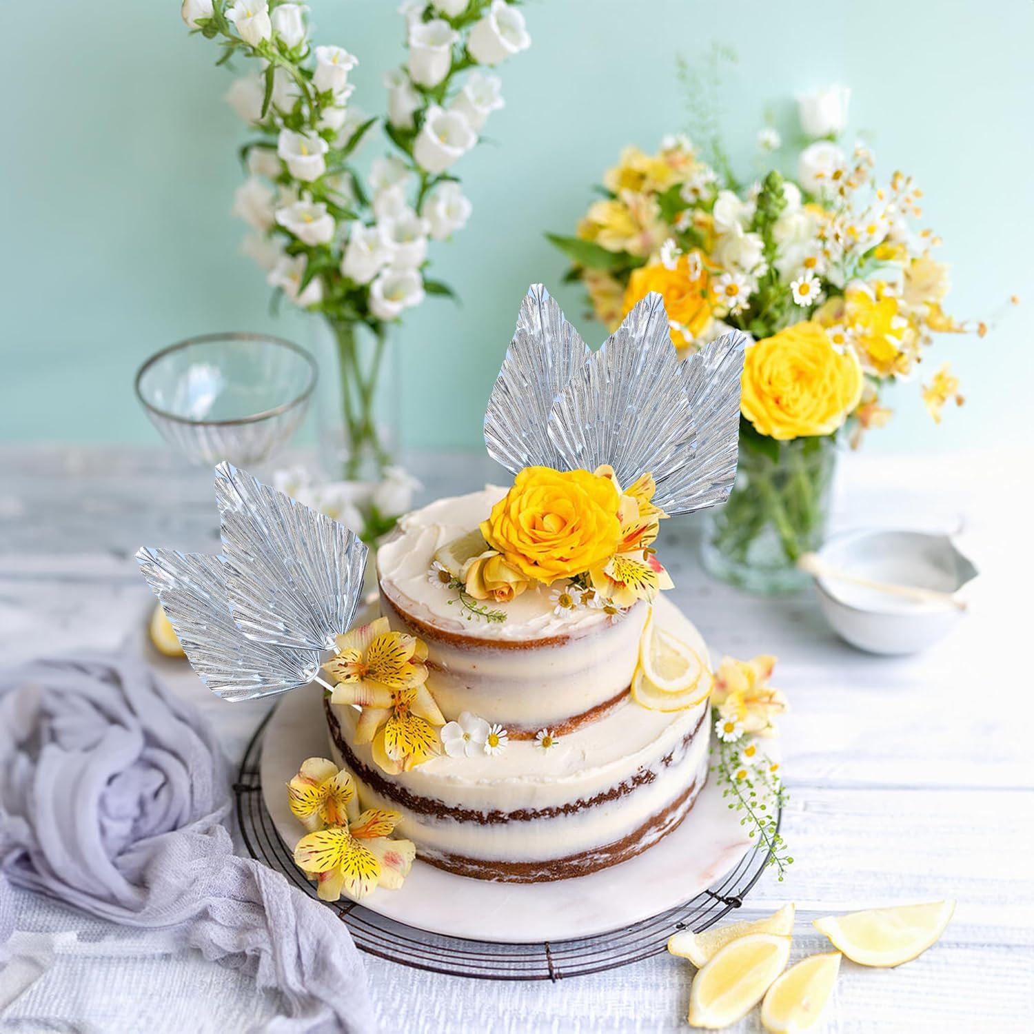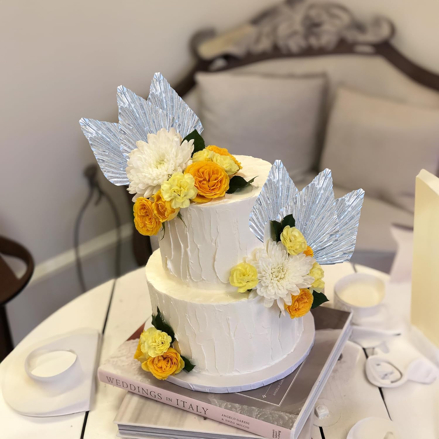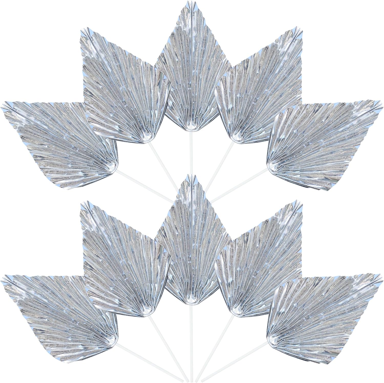 Ephlyn 6Pcs Paper Palm Leaves Fan Cake Toppers Palm Leaf Fan Cake Picks Craft DIY Fan Cupcake Toppers Palm Spear Leaves Cake Decorations for Baby Shower Wedding Birthday Party Supplies Bright Silver