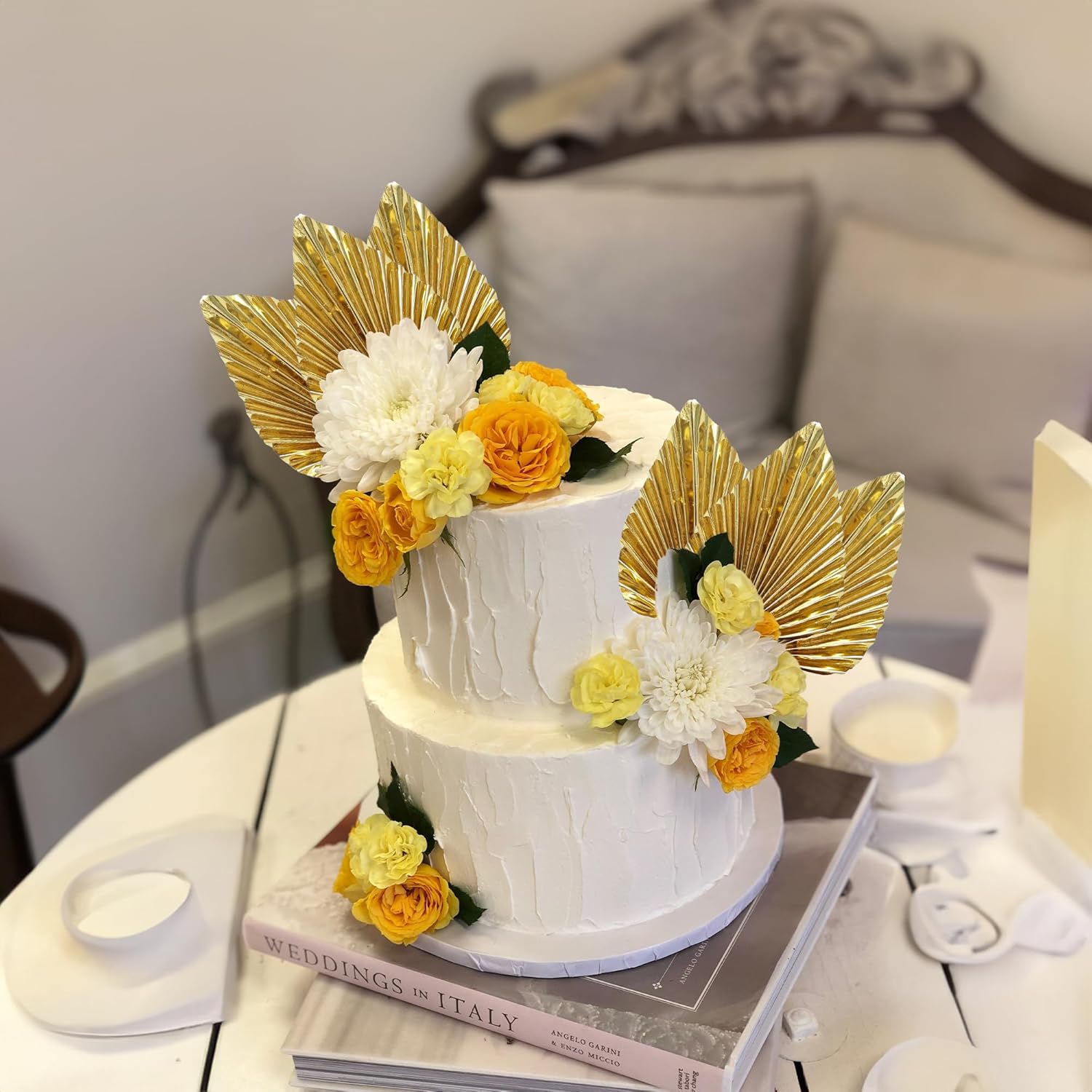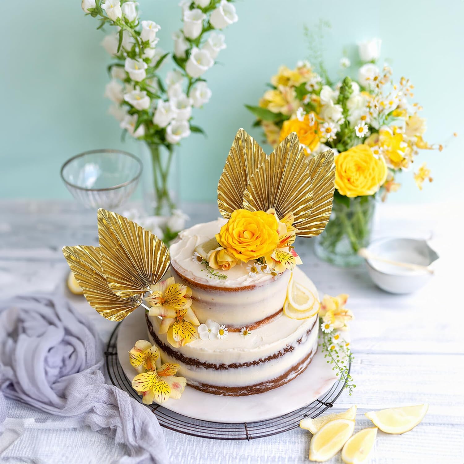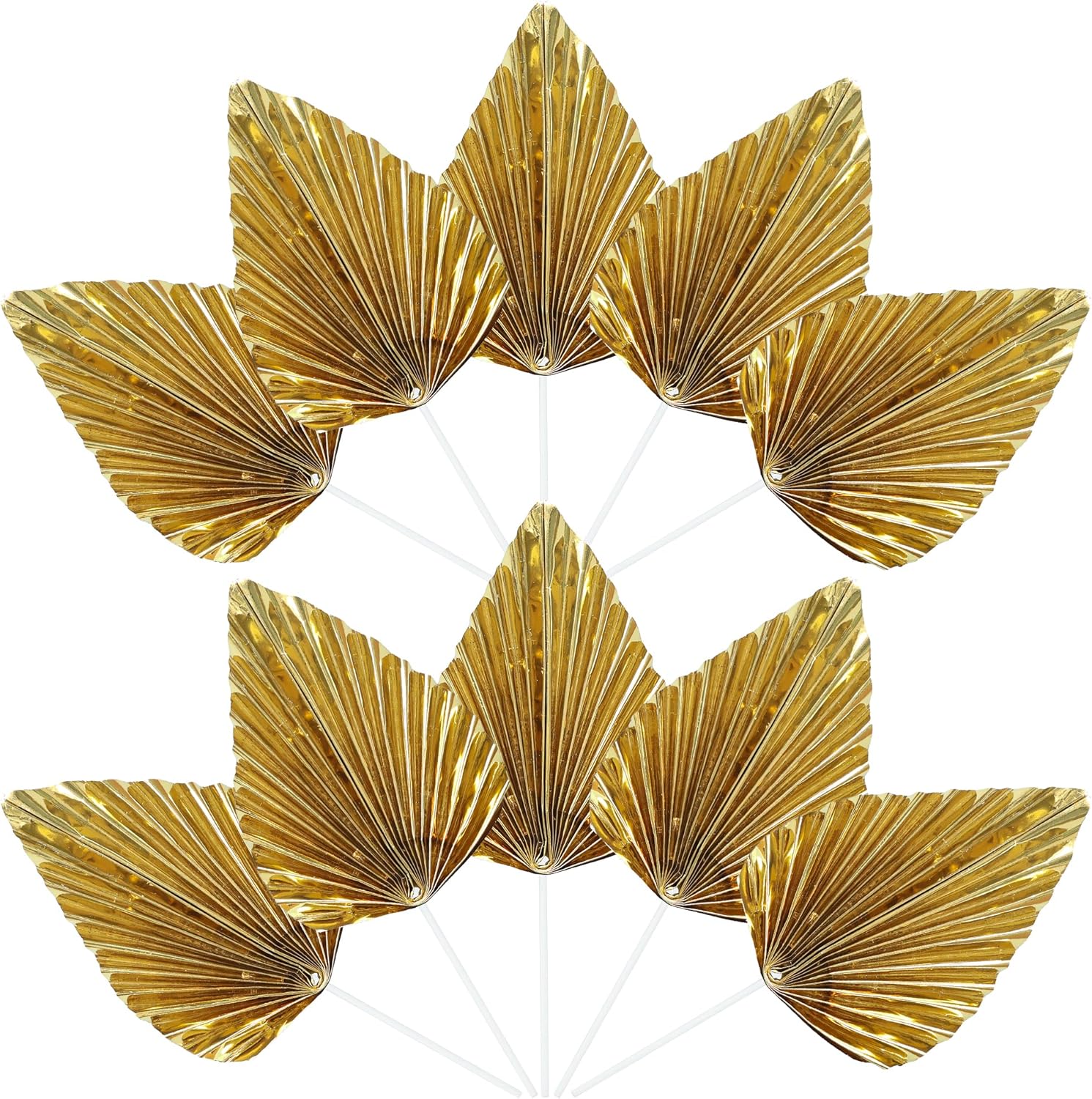 Ephlyn 6Pcs Paper Palm Leaves Fan Cake Toppers Palm Leaf Fan Cake Picks Craft DIY Fan Cupcake Toppers Palm Spear Leaves Cake Decorations for Baby Shower Wedding Birthday Party Supplies Bright Gold