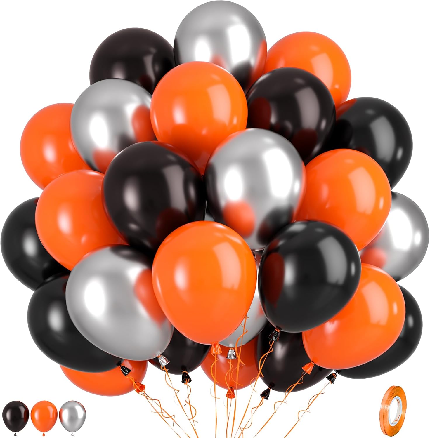 • 12 inch Black and Orange Balloons Set: 17pcs matte orange balloons, 17pcs matte black balloons, 16pcs metallic silver balloons, 1pcs orange ribbon in our party balloons set. From birthday to wedding, make your events unforgettable with our top-notch, reliable balloons that add a touch of elegance and fun.