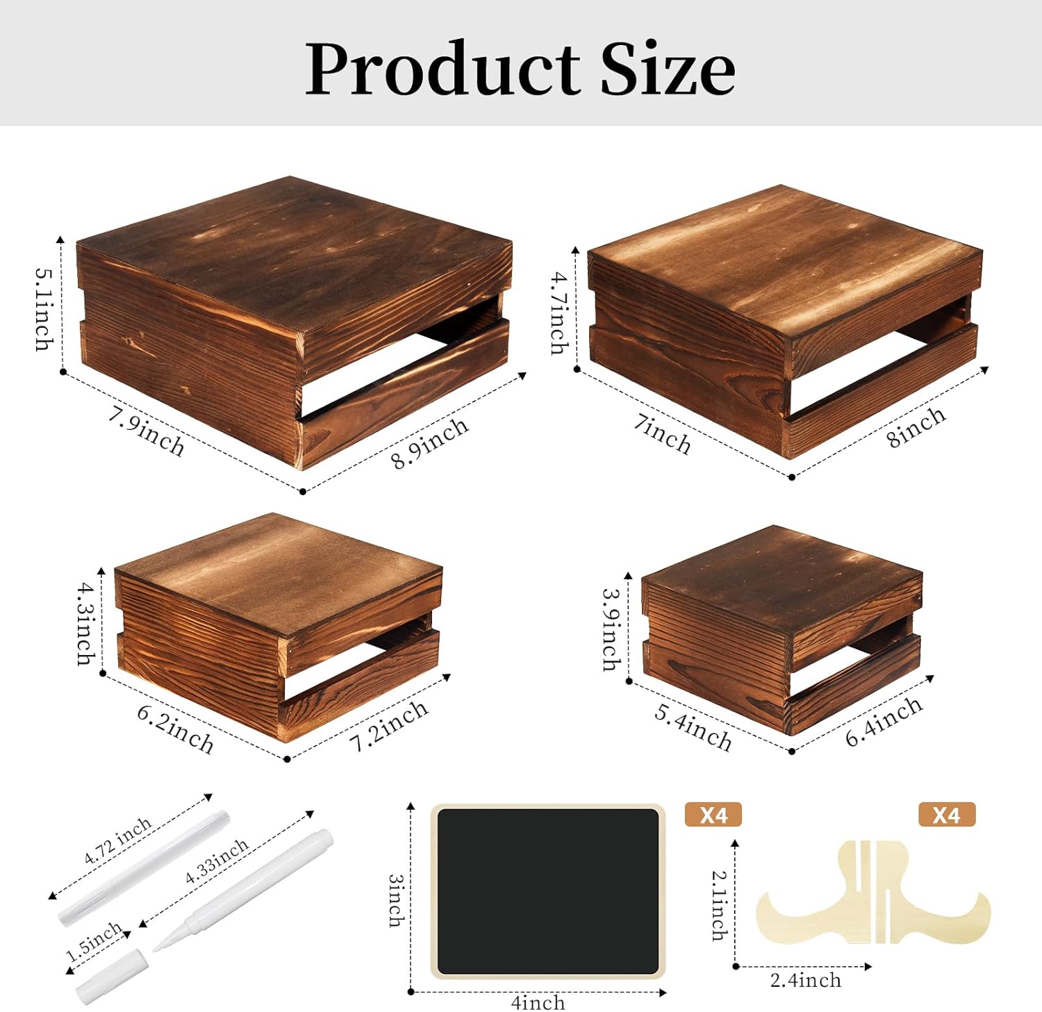 • Your Party's Sweet Companion: You will receive a set of 4 wooden cake stand risers (available in 4 sizes), 4 wooden signs and 2 pens, enough quantity and different sizes to meet the needs of different sizes of cakes, snacks and desserts for display. The wooden signs can be used to write down hints for ease of use while adding elegance to your dessert table.These wooden stackable display boxes will not take much displaying space