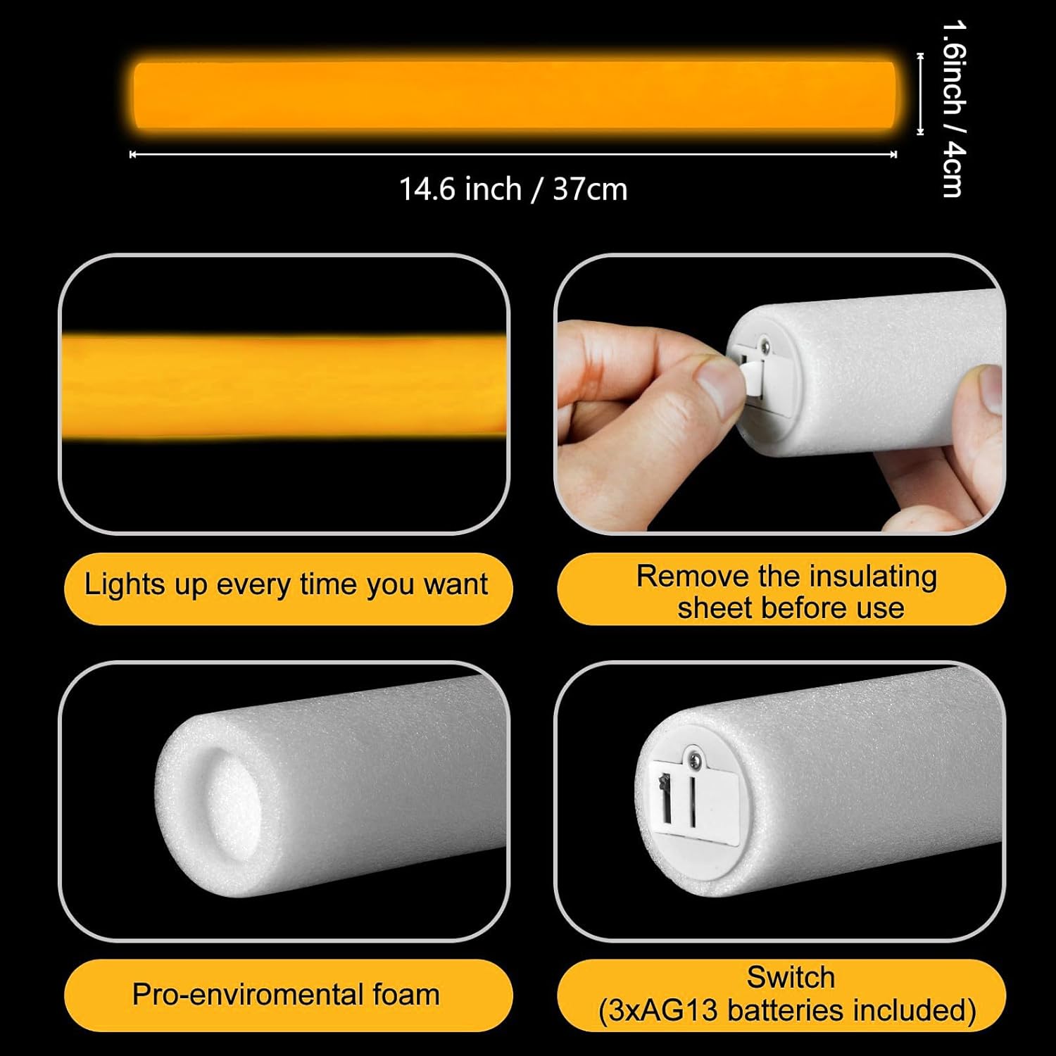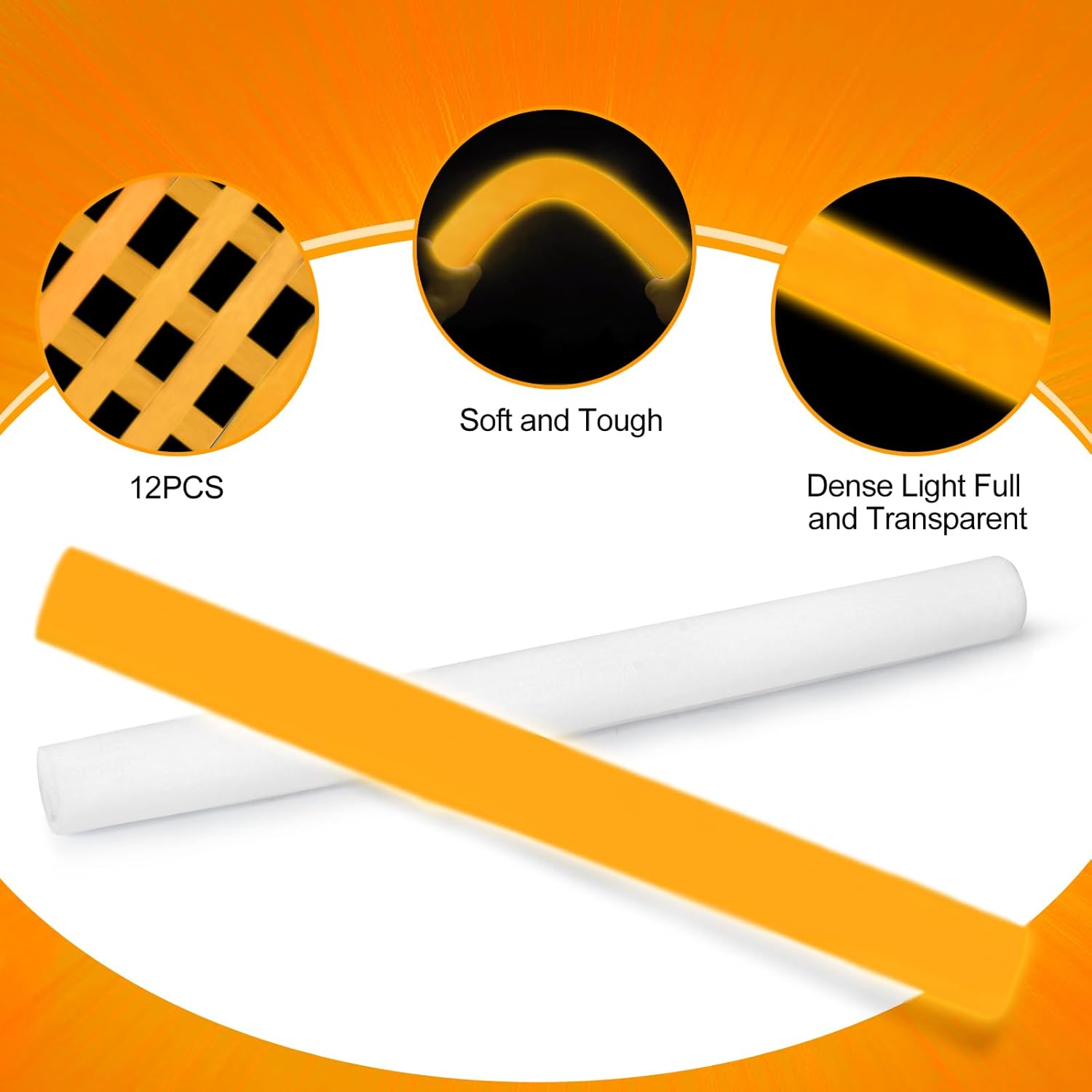 • Glow In the Dark Giant Foam Sticks: You will get 24 pack orange light up foam glow sticks. Press the power button to switch between the 3 different light up modes: quick flashing, slow flashing and alternately flashing. These LED foam sticks boast vibrant colors, offering wider light coverage and ensuring the excitement party experience,bring tons of joy for you and your families. Perfect for theme music festivals, birthday, camping, clubs, shows, goodie bag or stocking stuffer and more