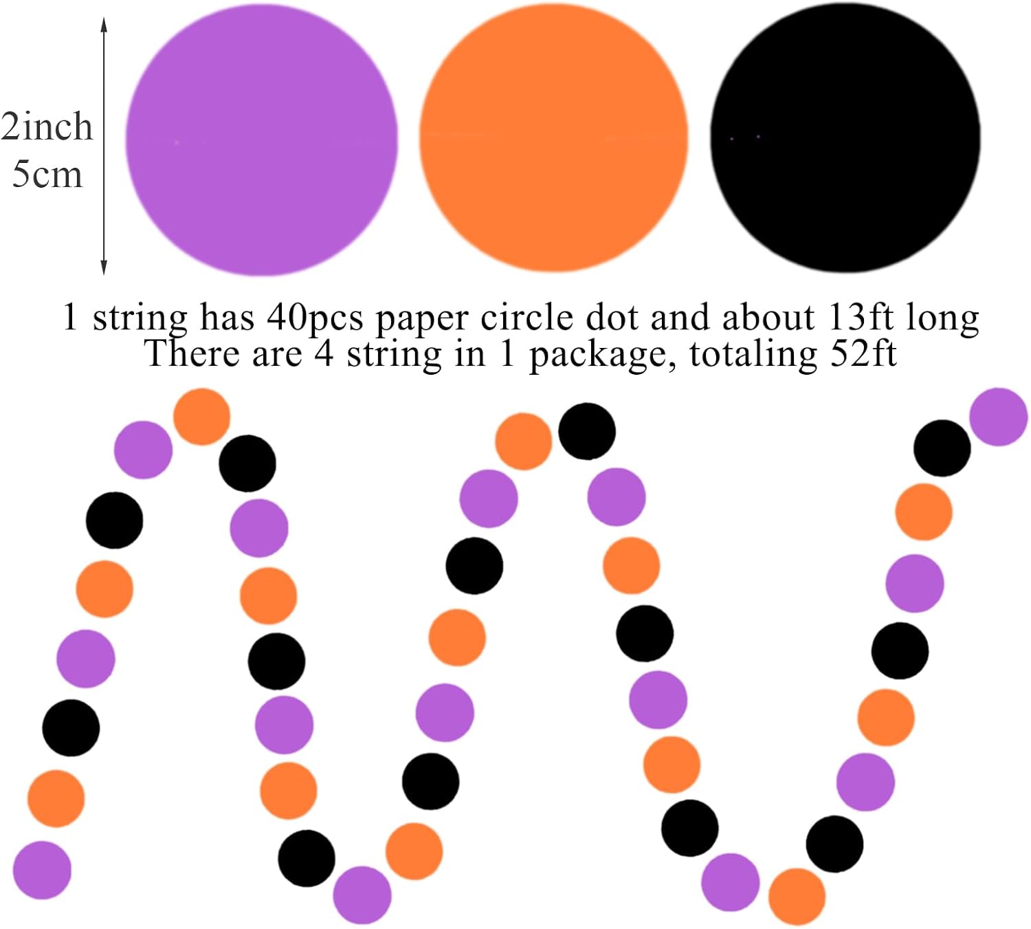 • 【Package Including】The decorations kit include 4 pack paper garland in 3 colors Black Orange Purple,each garland is approx 13 feet in length,totally 52 feet in length.Each one has 40 pieces of circle dots 1.97".