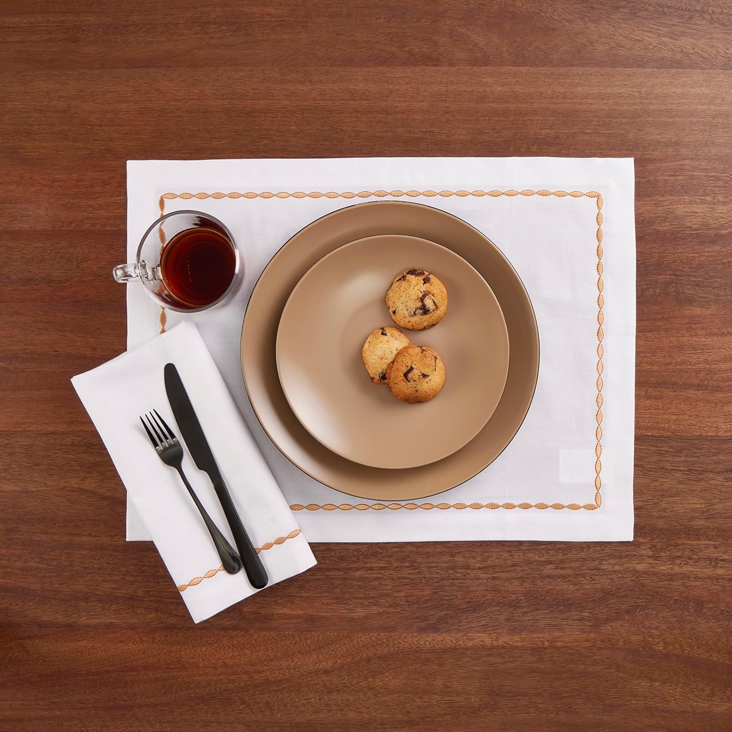 • Timeless Elegance: The "Threads of Grace" collection features intricate small motif embroidery on a crisp white cotton-linen base, offering a perfect blend of sophistication and simplicity for your table setting