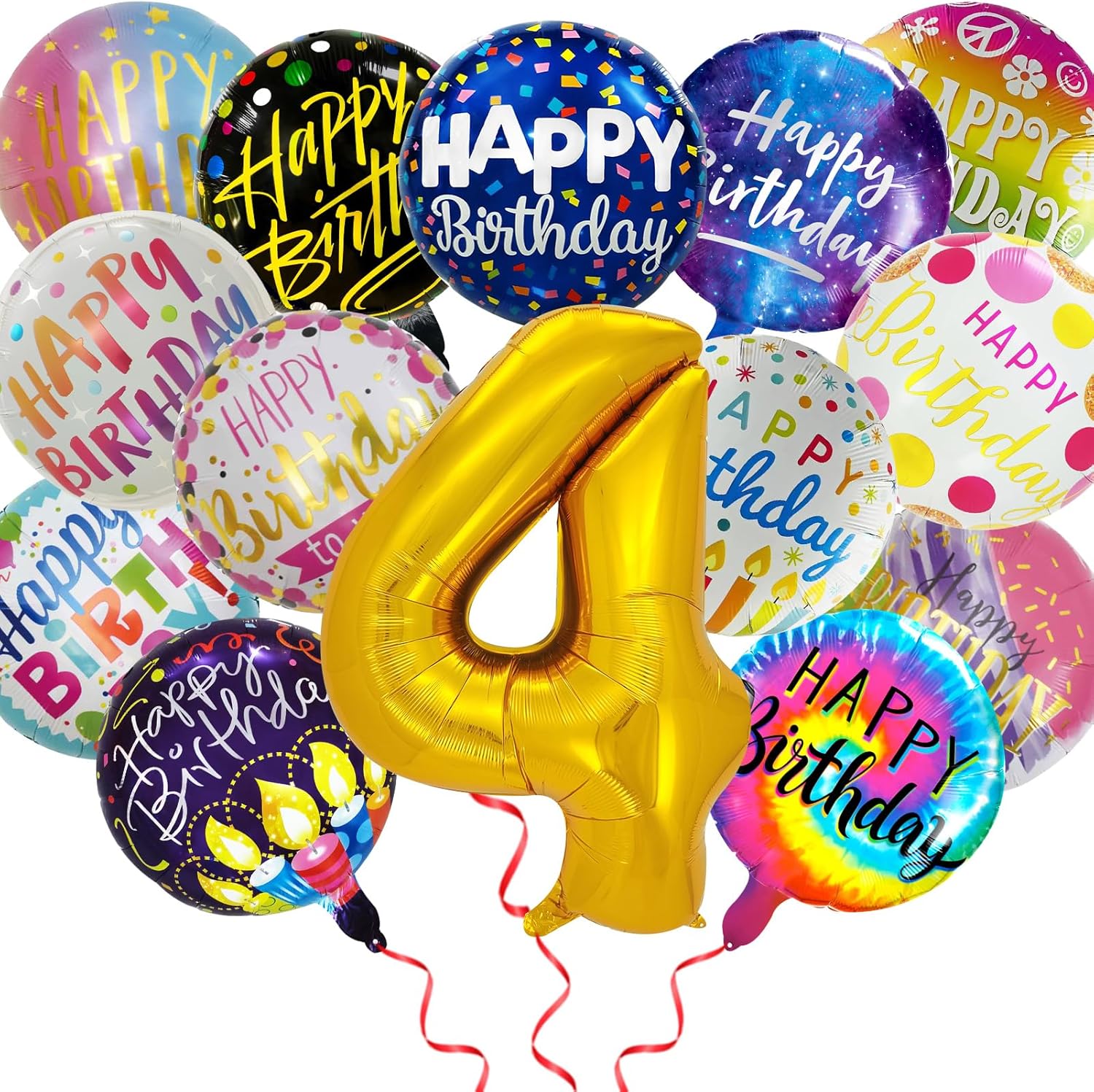 50 Pcs Happy Birthday Party Aluminum Foil Balloons and 4th Birthday Balloons, 18 Inch Round Aluminum Foil Balloon with" Happy Birthday" Sign, Birthday Party Decorations for Boys/Girls (4)