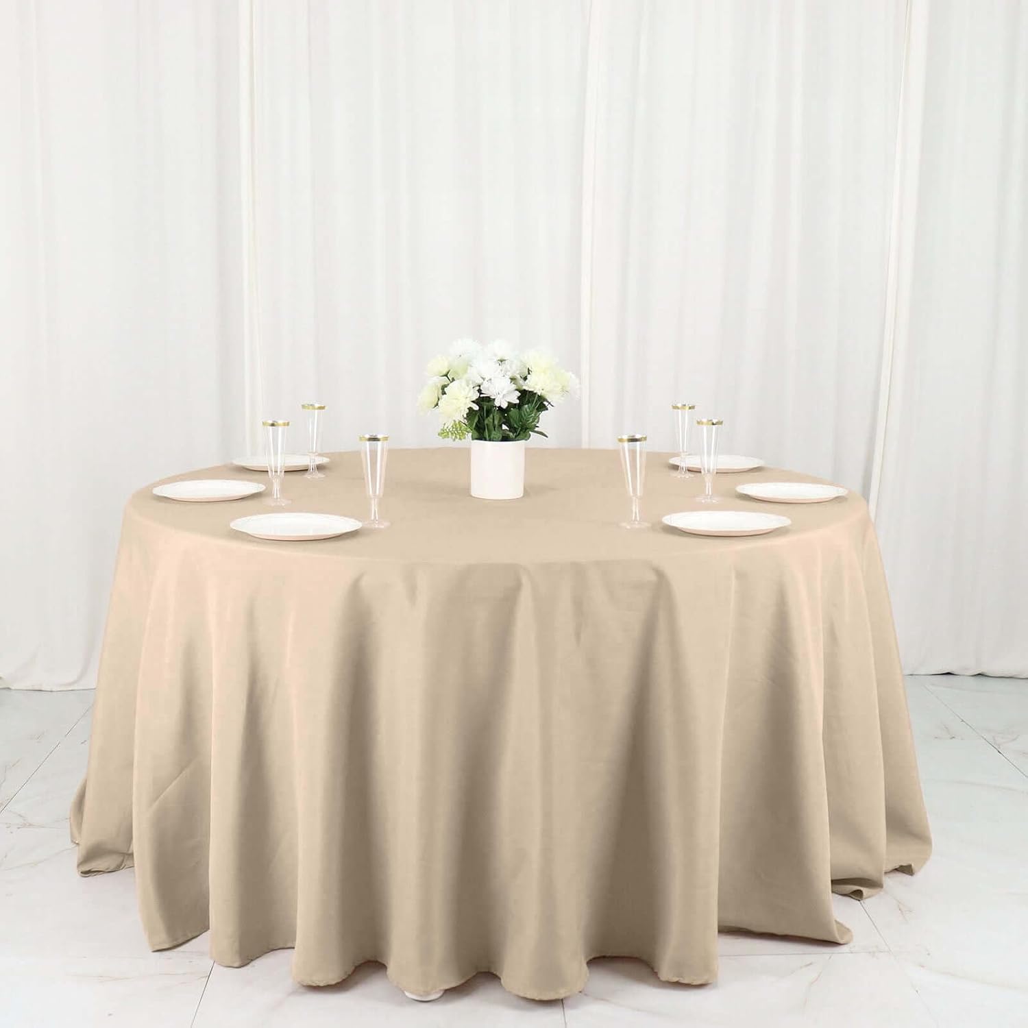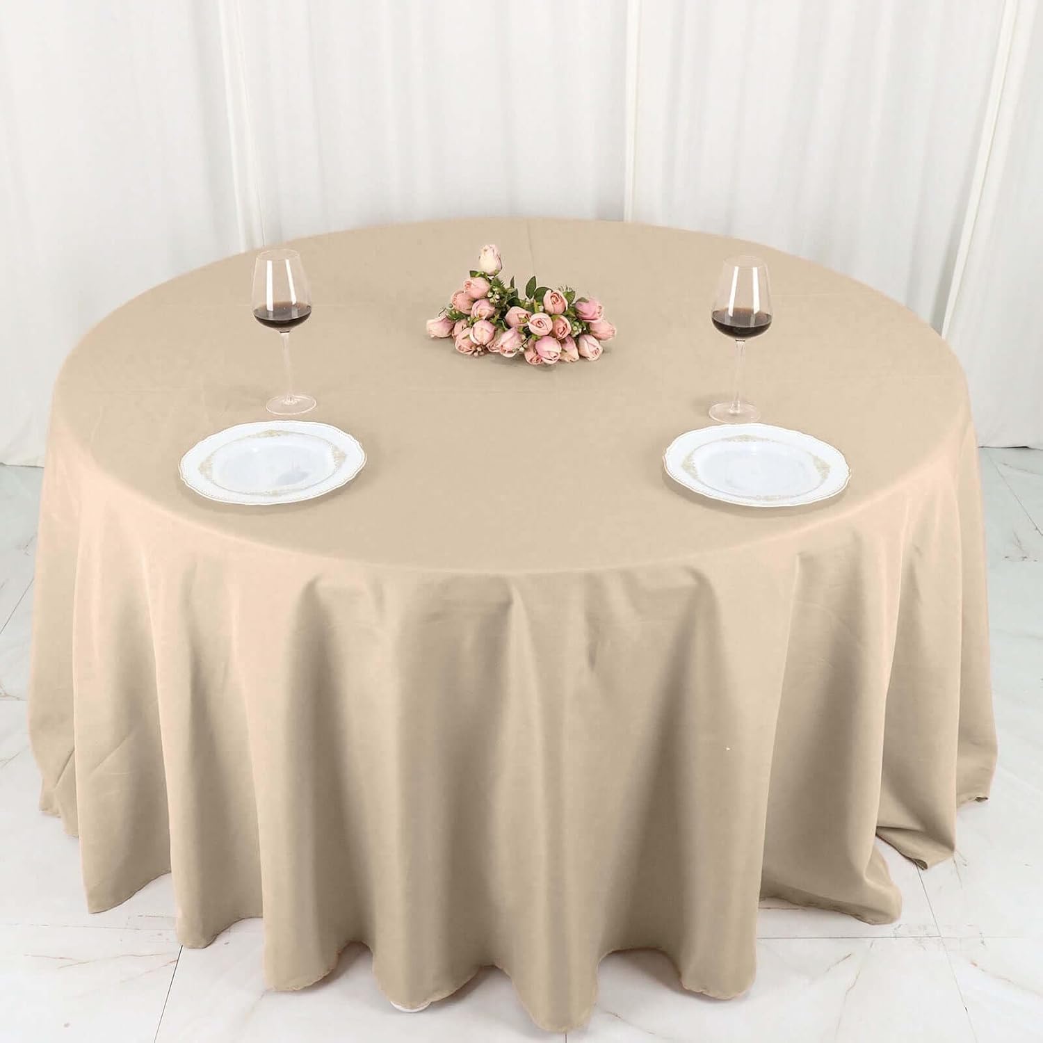 • Quantity: 1 Round Tablecloth Material: 100% Polyester Color: Nude Size: 132" Dia. Thickness: 130 GSM 1 pc, seamless design Stain & Wrinkle Resistant, Machine Washable Hemmed edges for an exquisite look. Gives floor length hang on standard 6ft (72") tables
