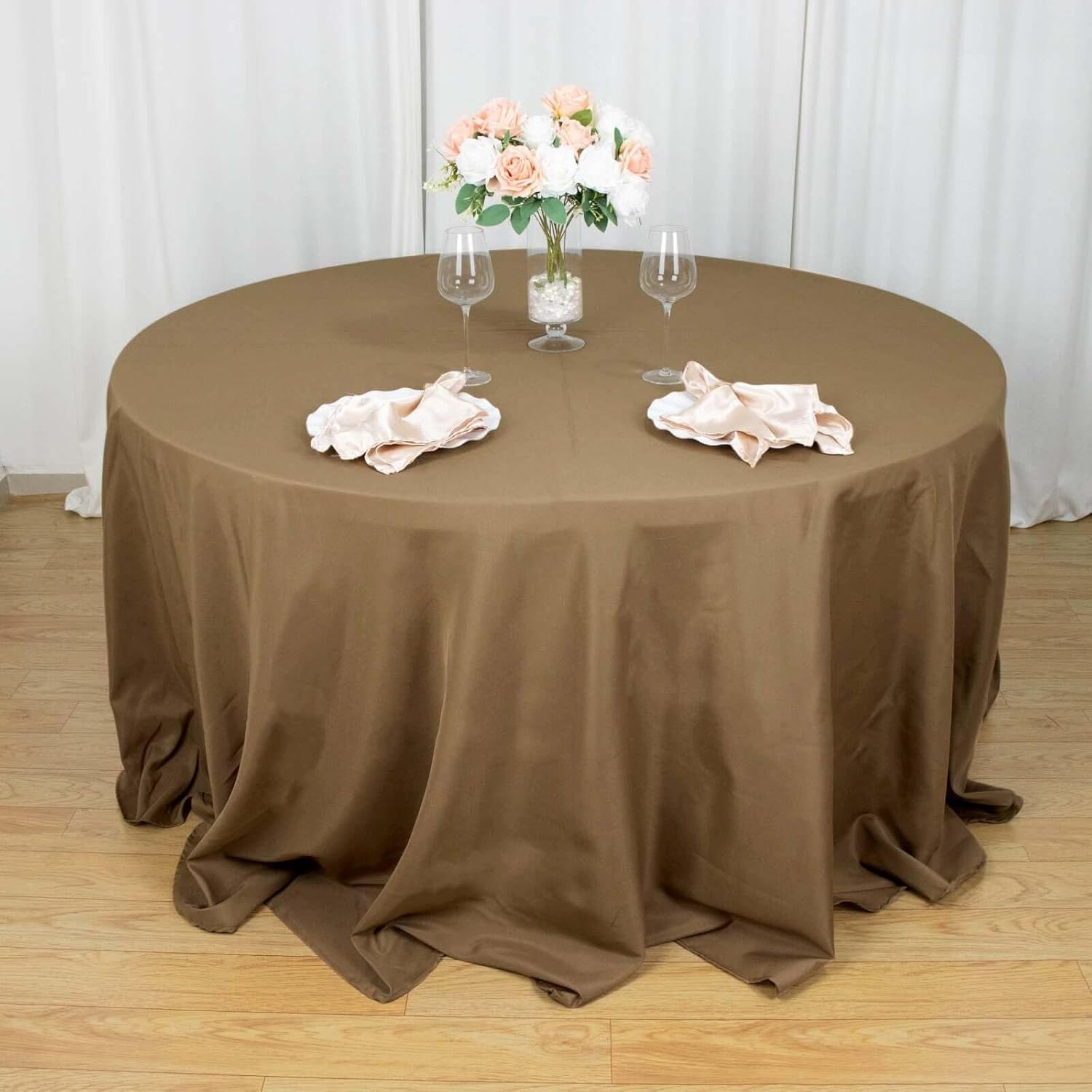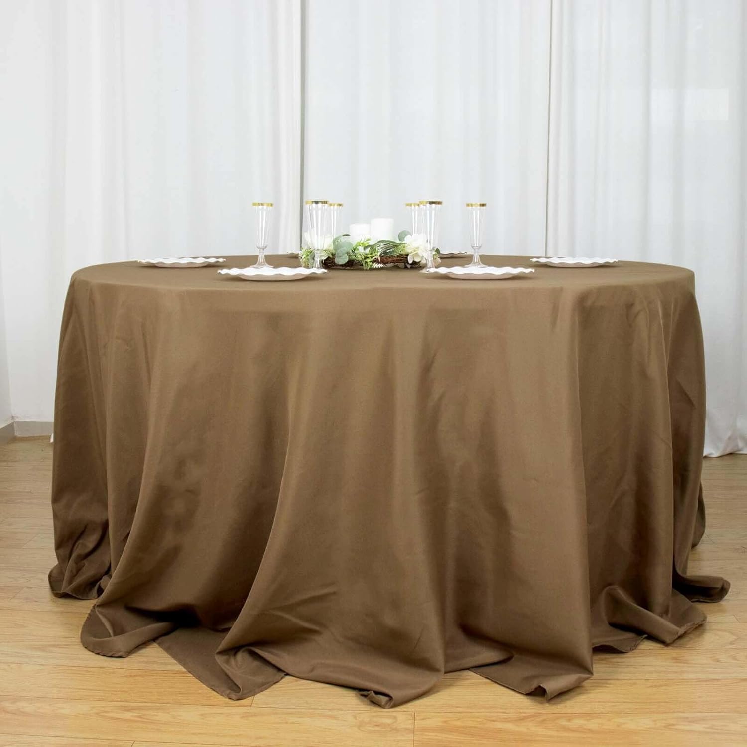 • Quantity: 1 Round Tablecloth Material: 100% Polyester Color: Taupe Size: 132" Dia. 1 pc, seamless design Stain & Wrinkle Resistant, Machine Washable Hemmed edges for an exquisite look. Gives floor length hang on standard 6ft (72") tables