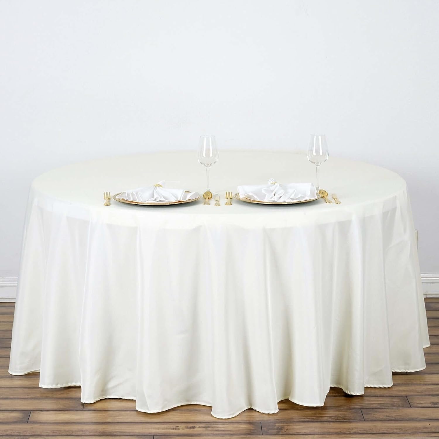 • Quantity: 1 Round Tablecloth Material: 100% Polyester Color: Ivory Size: 120" Round Thickness: 200 GSM Stain & Wrinkle Resistant, Machine Washable 1 piece, seamless design Hemmed edges for an exquisite look. Gives floor length hang on standard 5FT (60") tables All sizes are approximate measurements