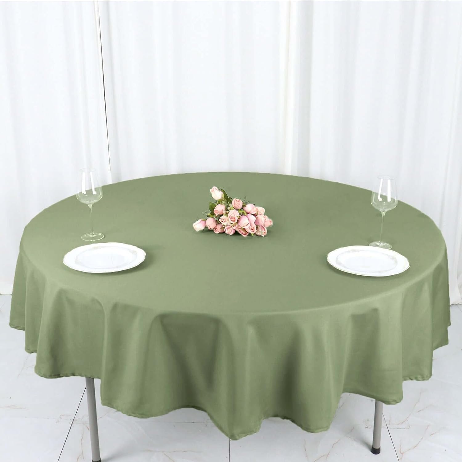 • Quantity: 1 Tablecloth Material: 100% Polyester Color: Eucalyptus Sage Green Size: 90" Round 1 piece, seamless design Stain & Wrinkle Resistant, Machine Washable Hemmed edges for an exquisite look.