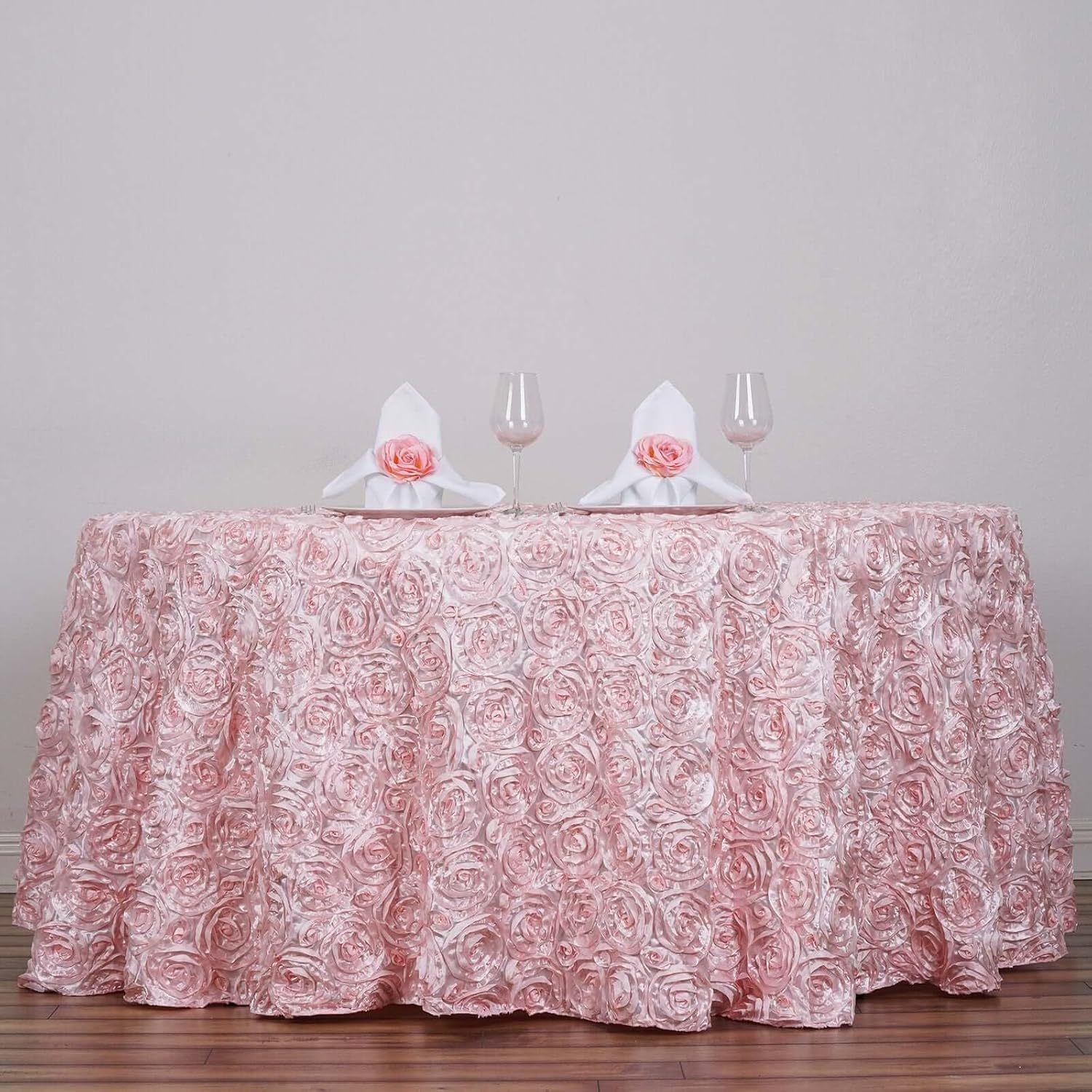 • Quantity: 1 Tablecloth Material: High Quality Satin Color: Blush / Rose Gold Style: 3D Rosette Size: 120"Dia. Edges: Serged Gives floor length hang on 5ft (60") table