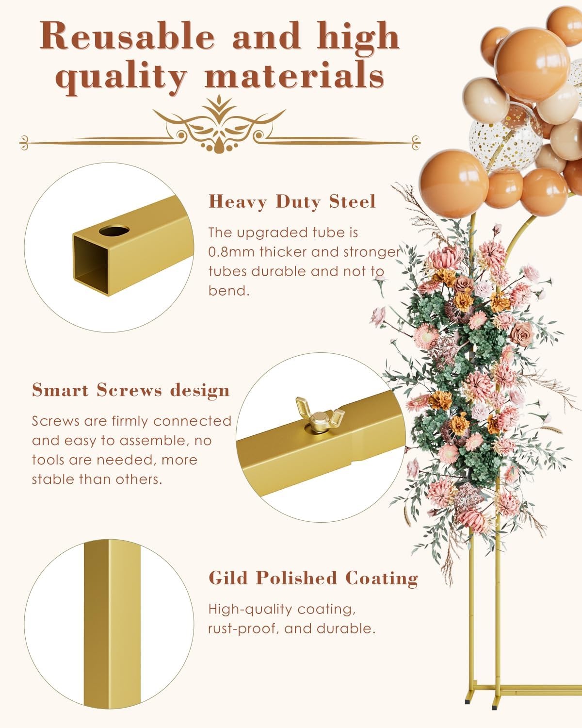 • Easy to Assemble: Our metal wedding arch stands, including a wedding arch frame suitable for balloon arch backdrops, are made of sturdy and lightweight square steel pipes with a bright gold color. With a higher bearing capacity and easy assembly, the arch frames can be quickly put together with screws in minutes. The metal arch backdrop stands are designed for easy disassembly by a single person, making setup convenient and hassle-free for any event.