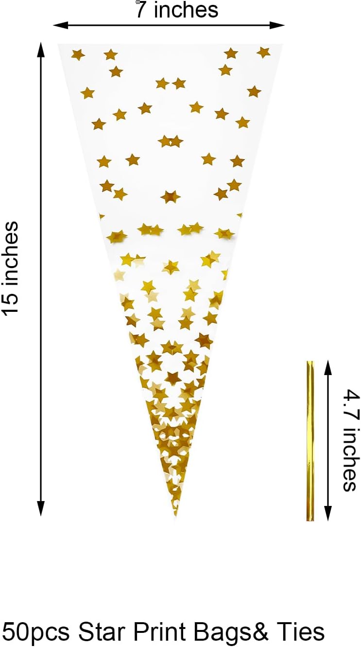 • 【Unique Triangle Design & Festive Print Options】: Featuring a unique cone shape with multiple print options, including clear, gold stars, and colorful sprinkles, these bags add a festive touch to your packaging. Choose from transparent or printed designs to match any occasion, making them perfect for seasonal celebrations and parties.