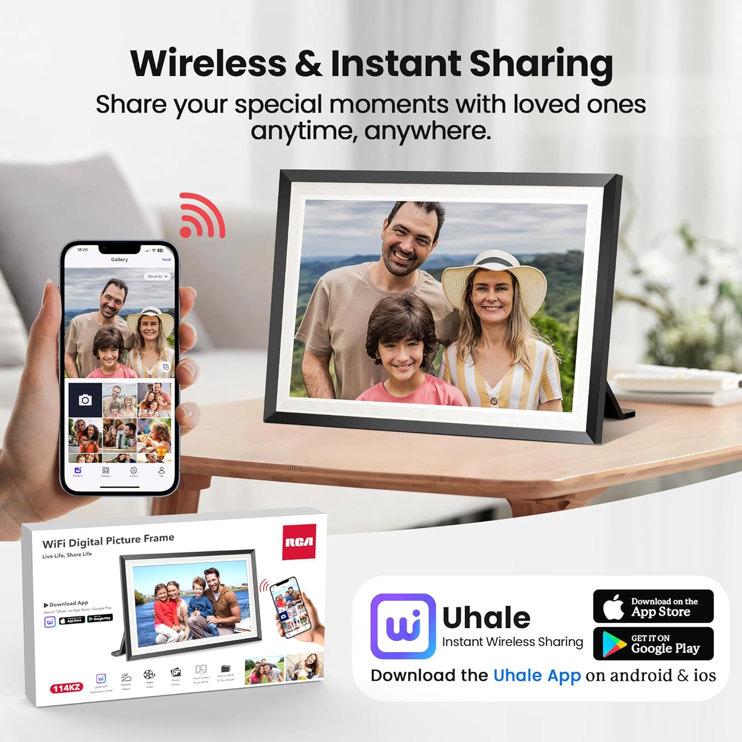 • 1.Private Wireless Sharing with Phone and PC - Connect the Digital Picture Frame to your WiFi network and download the "Uhale" App without payment on Android or iOS. There’s no limit on the number of users you can add. You can invite anyone to privately and securely share photos and videos to the digital photo frame at any time. Additionally, you can upload photos directly from your computer to the WiFi Picture Frame through the "Uhale" website.