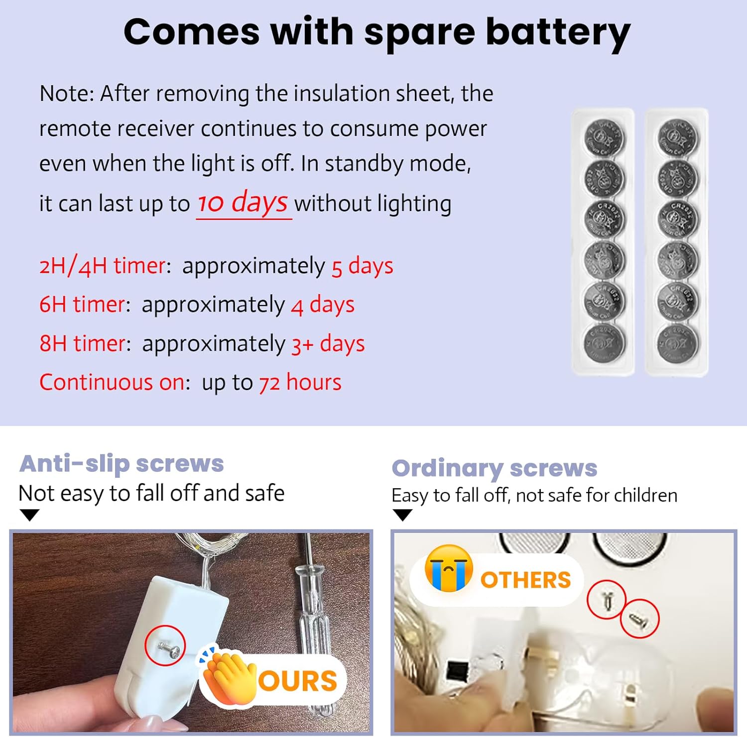 • 【Battery Powered & Remote Control】: Say goodbye to manual switches! Effortlessly control your lights with the included remote, adjusting settings from a distance for maximum convenience. Each light set is powered by 2 CR2032 batteries (included and replaceable).