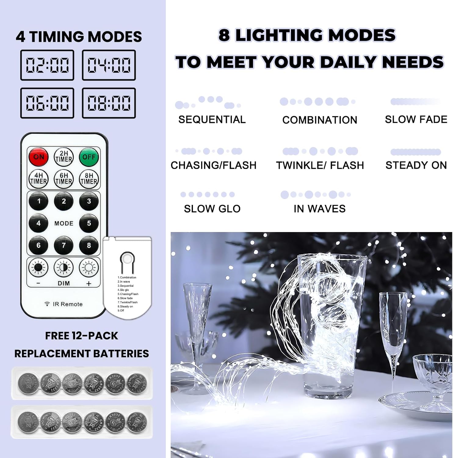 • 【8 Lighting Modes】: Choose from 8 different lighting effects to match the mood of your space or event. Perfect for decorating your garden, Mason Jars, wedding, balcony, corridor, fence, shelf, bistro, pub, cafe, flower shop, patio, party, Halloween, Christmas tree, Thanksgiving, etc. anywhere indoor or outdoor usage of lighting decorations and projects.