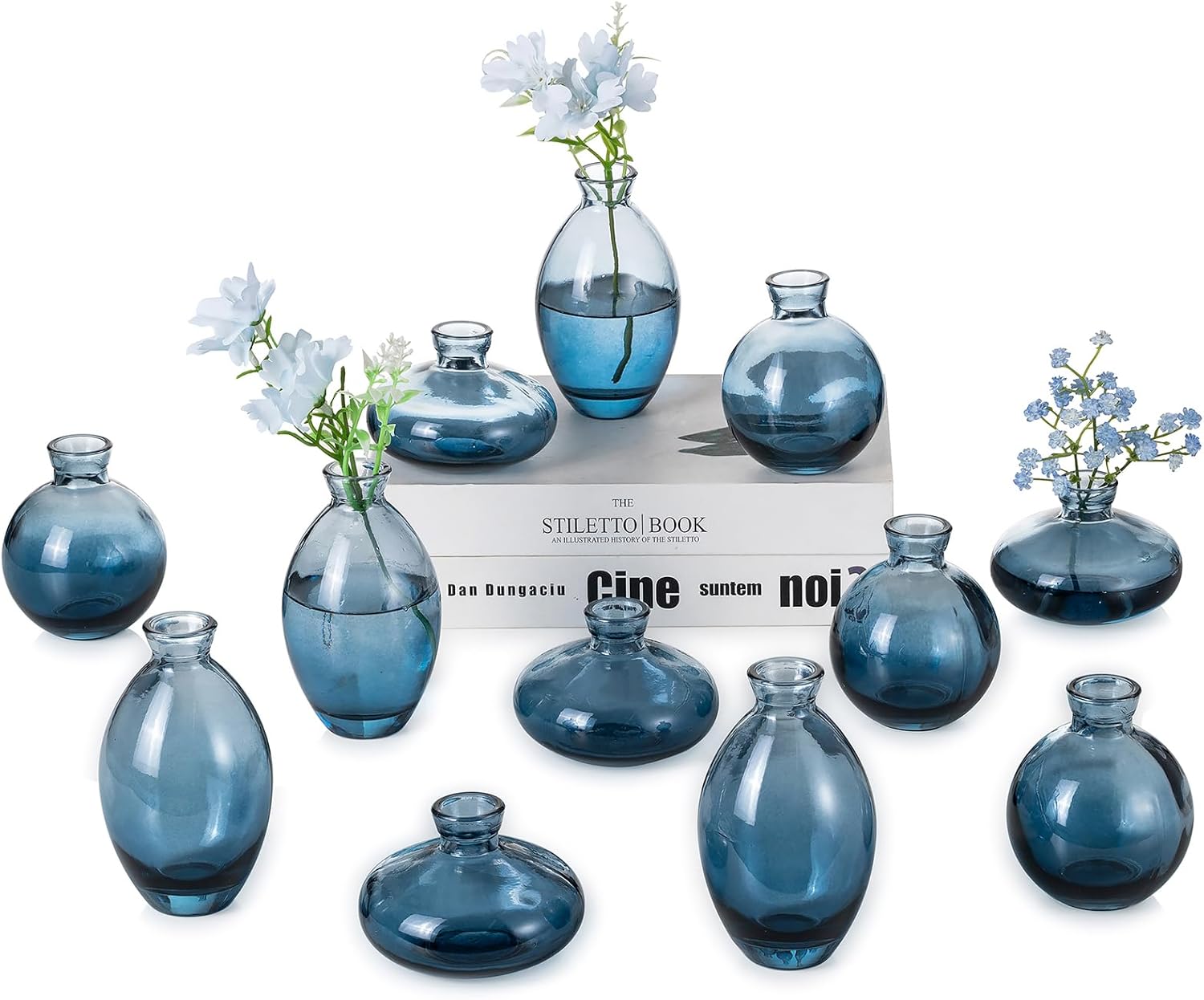 Hewory Glass Bud Vases for Centerpieces: Set of 12 Cute Blue Small Vases Handmade, Mini Flower Vase for Floral Arrangement, Tiny Decorations for Home Office Wedding Reception Party Events Table Decor