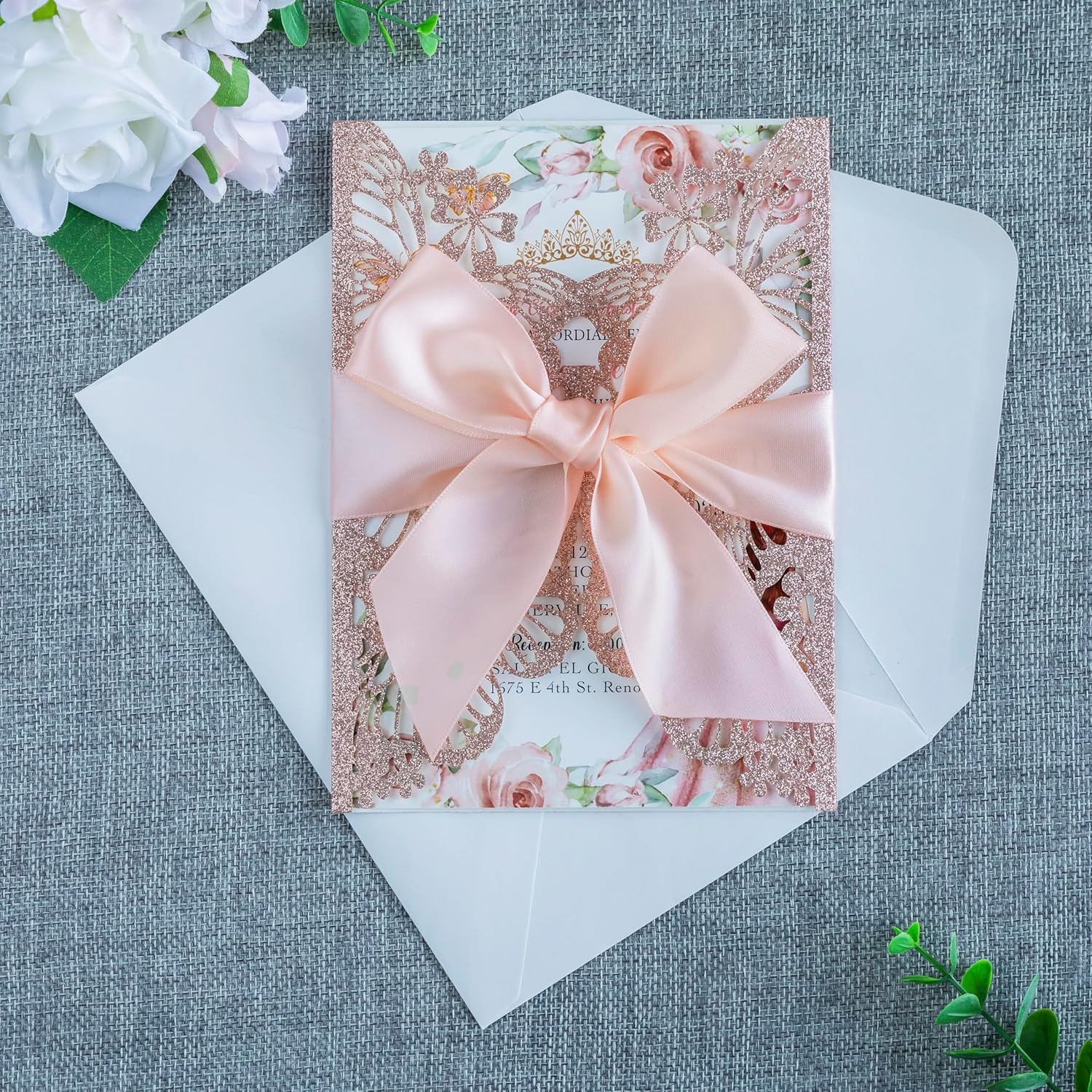 • Size of kit: laser cut invitation pocket: 5.12x7.2 inch, inner sheet card: 5x7 inch, envelope: 5.35x7.7 inch, Ribbon: 29.5x1.5 inch