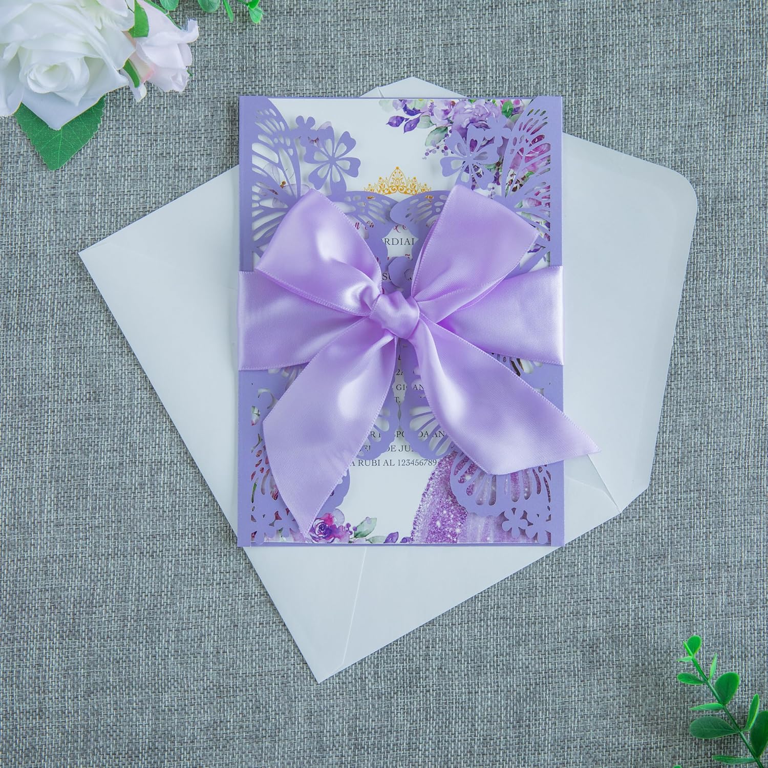 • Package include: 20 x envelopes, 20 x laser cut invitation cards, 20 x customized sheets, 20 x ribbons