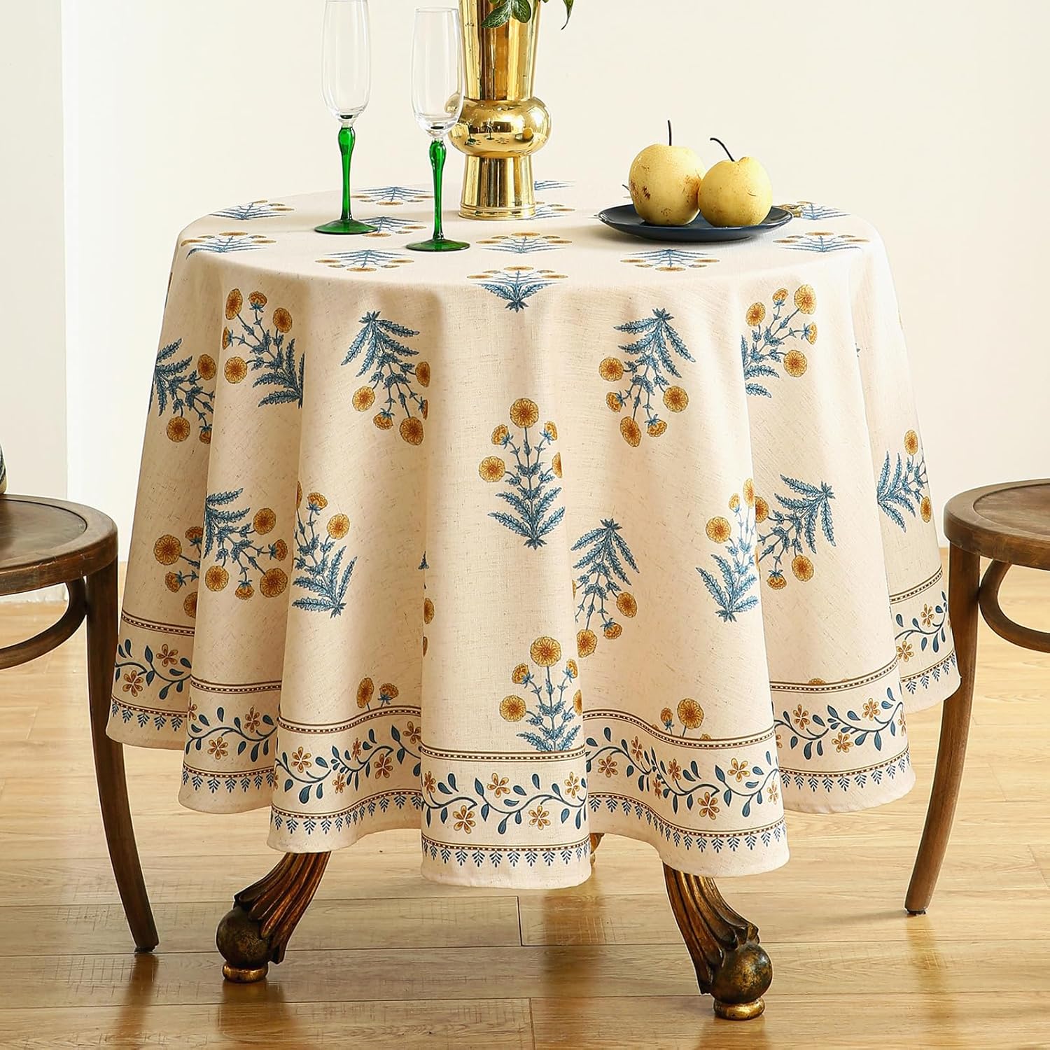 ISAENNE Designer French Pale Yellow Round Tablecloth,Linen Floral Table Cloth,Wrinkle Resistant Decor Tablecloths for Dining Thanksgiving Banquet Kitchen Party,Diameter 67"-Estevan A