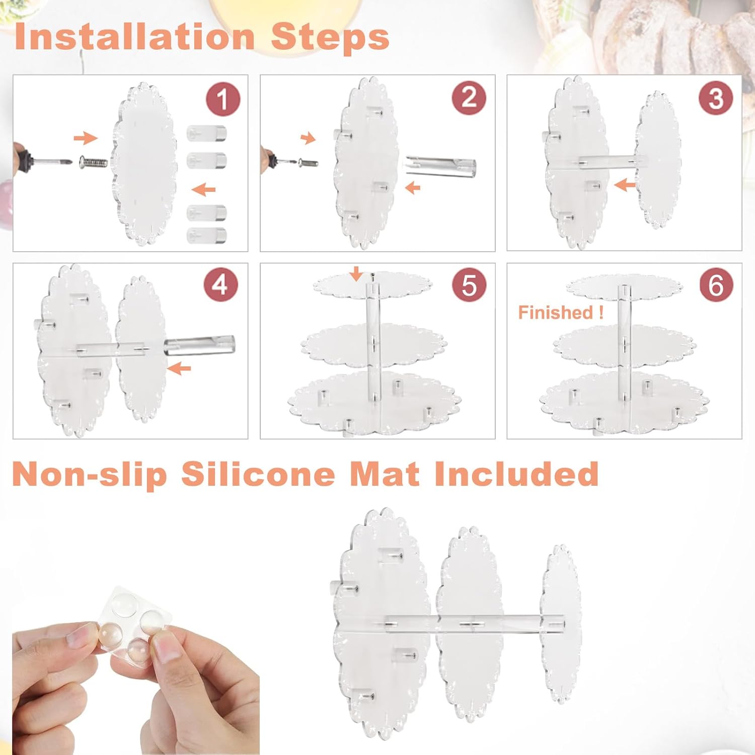 • 【DIY Macaroon Cupcake Holder】The 3-tier cupcake display stand can easily install one by one from big to small. Connect the acrylic rod and plate with screws and tighten all the parts, quick and easy to make a special dessert plates for your party. 4 anti-slip stickers are added to the base to keep the bracket stable