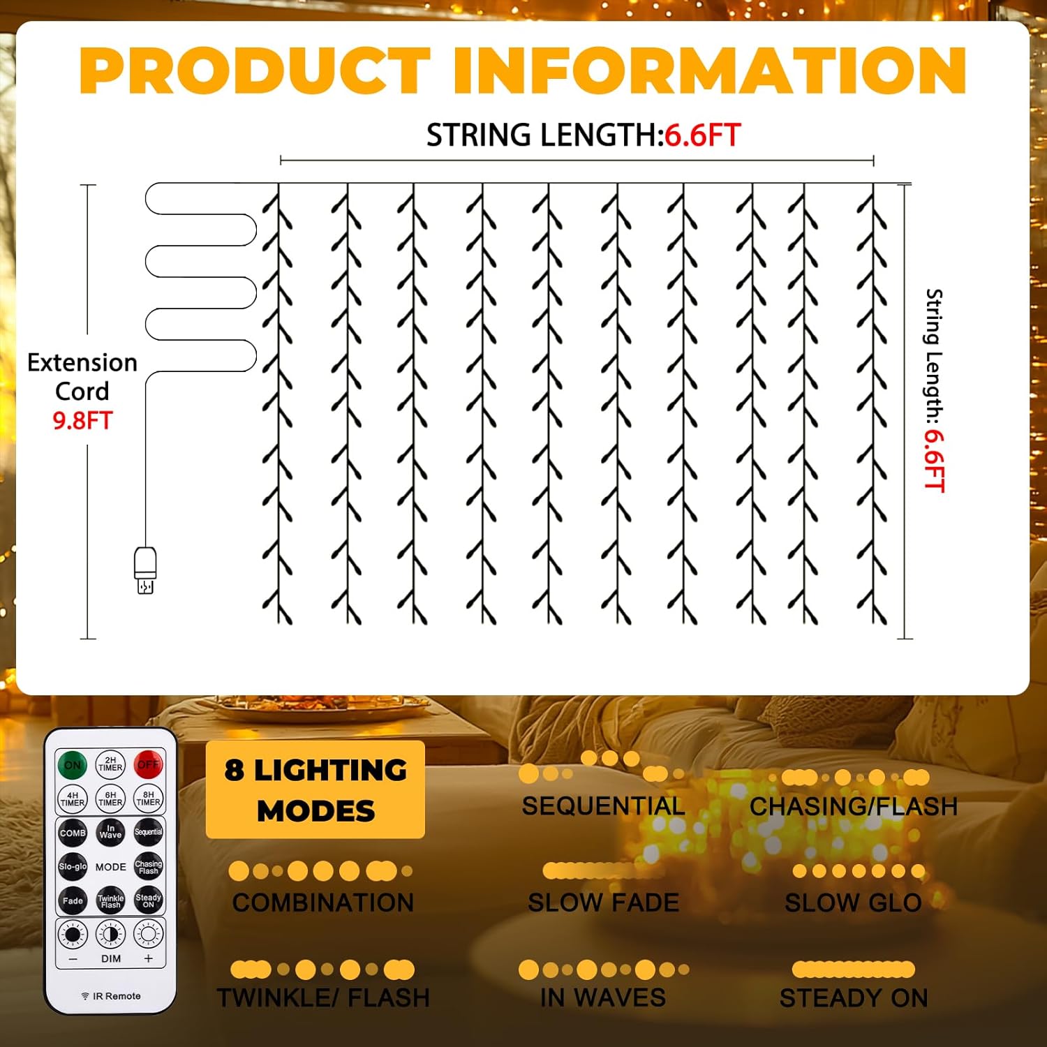 • Tangle-Free Curtain Lights: 200 super bright LED bulbs, the 6.6x6.6Ft curtain lights come with a 9.8Ft extension cord; With 10 drop light strings, each holding 20 LEDs, and convenient hooks at the top for easy hanging, they effortlessly add warmth and sparkle to any room, creating a dreamy, fairytale ambiance that fills your space with joy and serenity