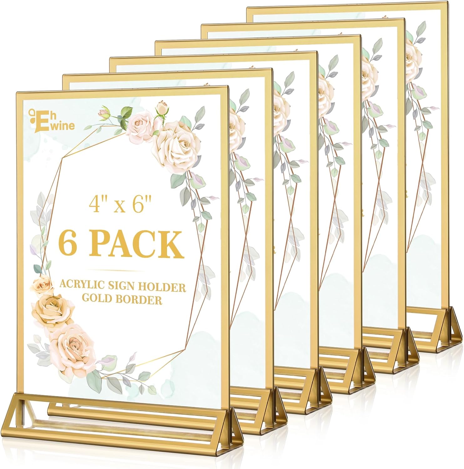 EHWINE 6 Pack Acrylic Sign Holder 4 x 6, Double Sided Gold Picture Frame Stand up Table Top Sign Holders, Clear Display Stand Menu Flyer Holder for Wedding Party