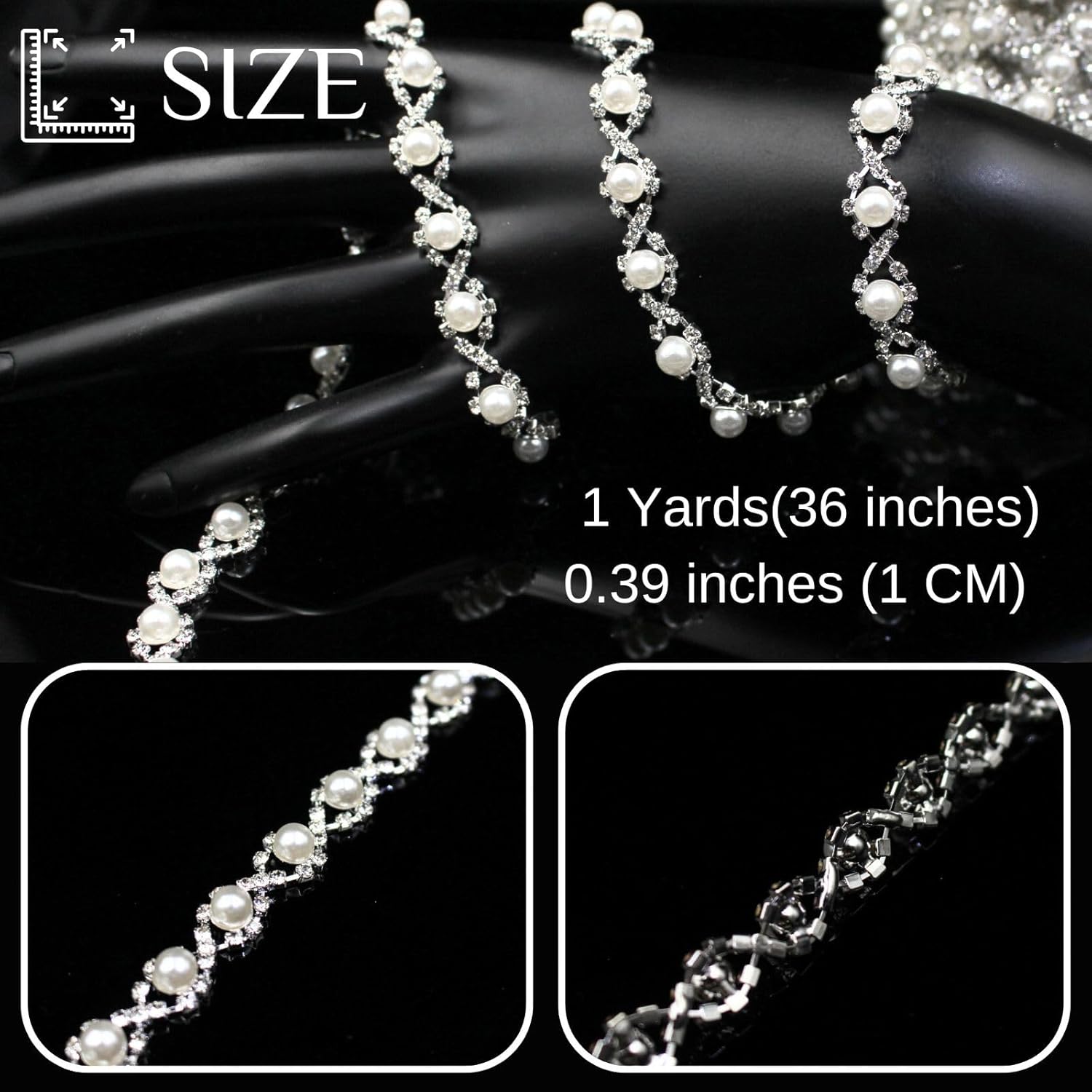 • Size: You will receive one roll of rhinestone chain, approximately 1 yard long and 0.39 inches (1 cm) wide, which is sufficient to meet your various decoration needs. You can also share it with friends or family. It's perfect for sewing trim and embellishments, and pearl garlands are also a great choice