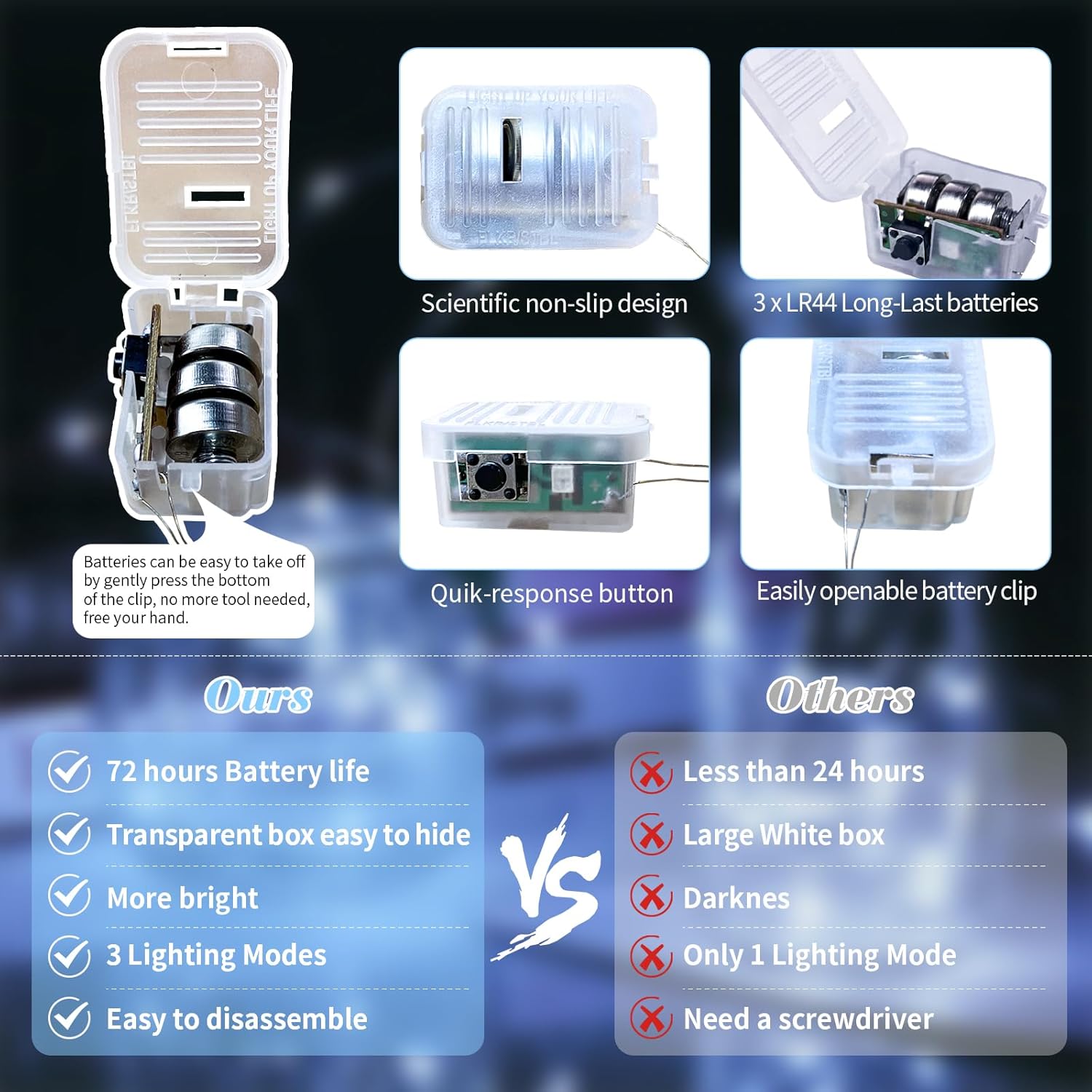 • PREMIUM QUALITY AND LONG LAST LIFE: 12 pack in a box, each twinkle lights made of high quality durable 7 feet long flexible silver wire, and 20 energy-efficient mini led fairy lights, 4 inch distance between each led moon lights. This fairy lights battery operated by 3 x LR44 batteries (included), which can provide 95 hours life. This Christmas lights is perfect for both everyday decorations as well as holiday decor (Batteries need to be replaced when the string get dims)