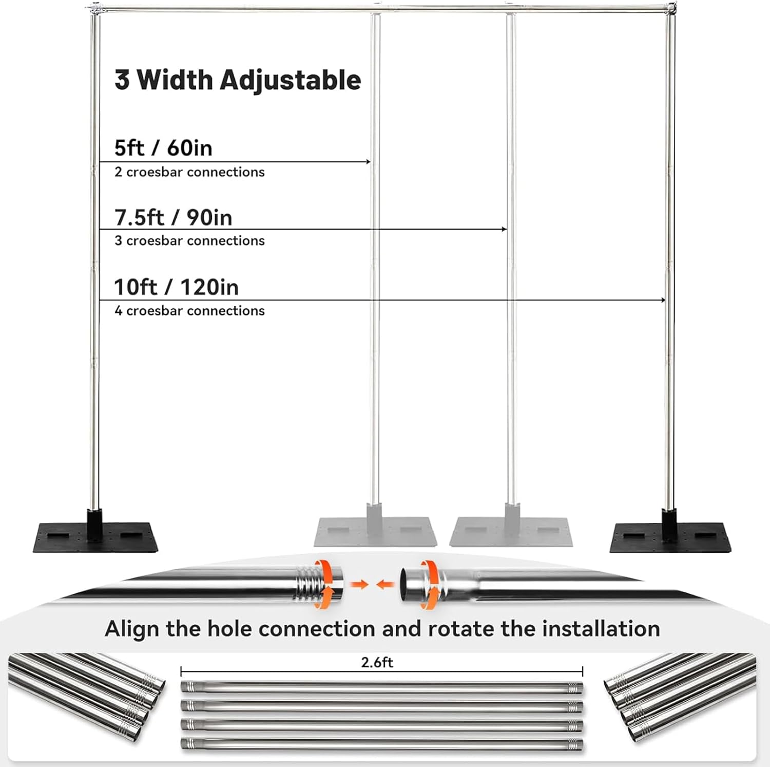 • Wide Applications: The backdrop stands are great for hanging curtains, balloons, string lights, flowers, and more. Perfect for weddings, holiday parties, photography backdrops, photo booths, banner stand bsackgrounds and so on.