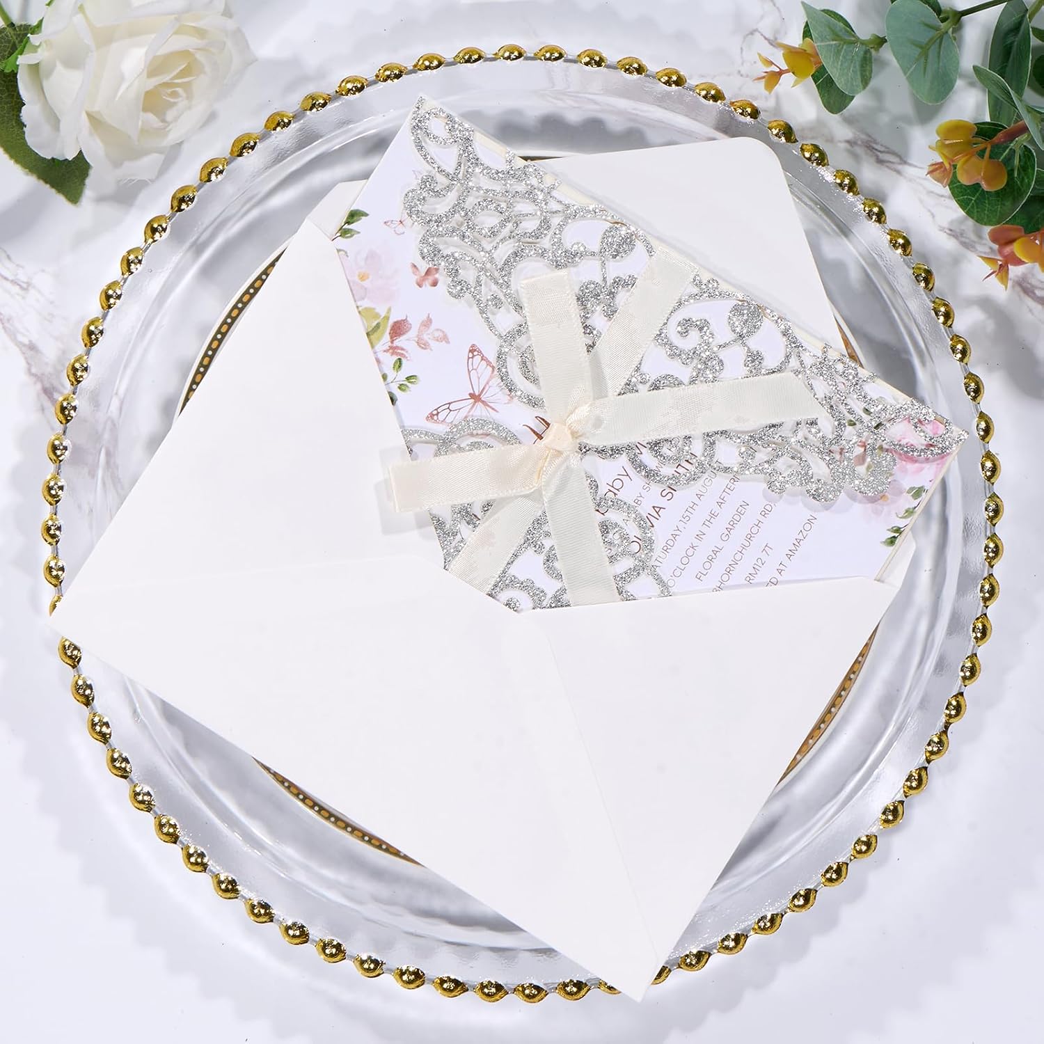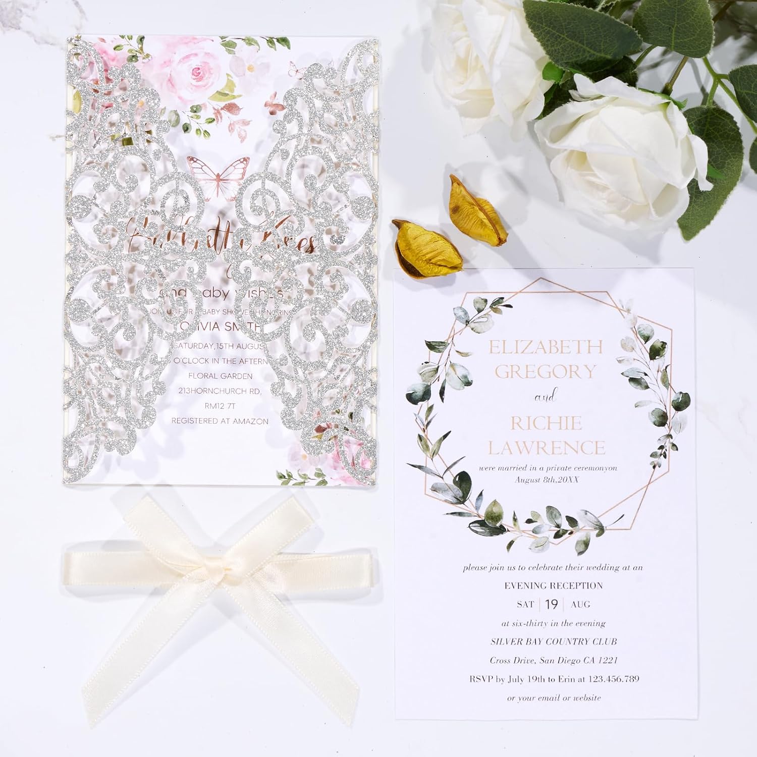 • Details: Glitter laser cut invitation pocket made with laser cutting process, floral hollow pattern; Inner Invitations card and rsvp are made by 250GSM peal paper; Champagne pre-tied bows with double-sided tape.