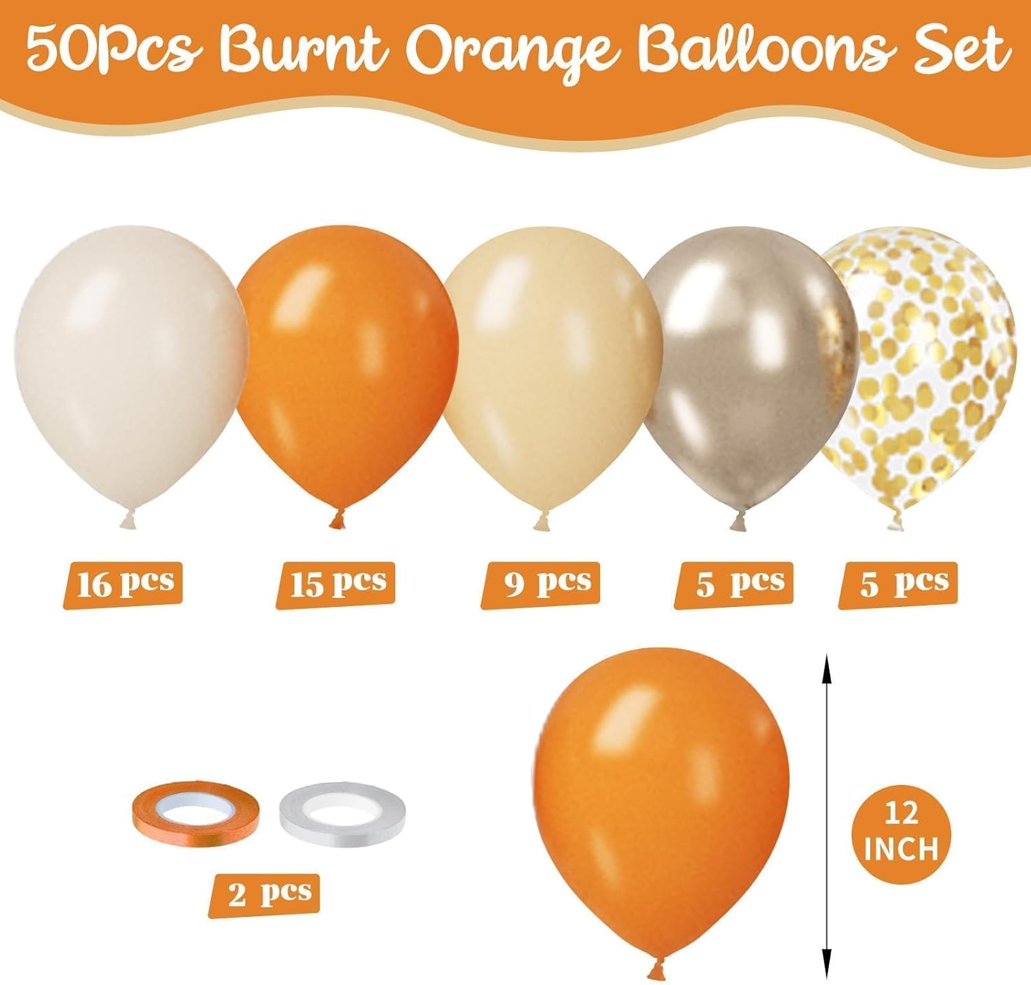 • 【WHAT YOU WILL GET】Our birthday party balloons include 50pcs retro orange and sand white balloons, designed to help you create stunning decoration: 16 x retro sand white balloons, 5 x metallic champagne gold, 9 x retro apricot balloons, 15 x retro orange balloons, 5 x confetti gold balloons, 1 x orange ribbon, and 1 x white ribbon. The size of the balloon is about 12 inches after inflation. The combination of orange and champagne gold can make party or occasion more classy.