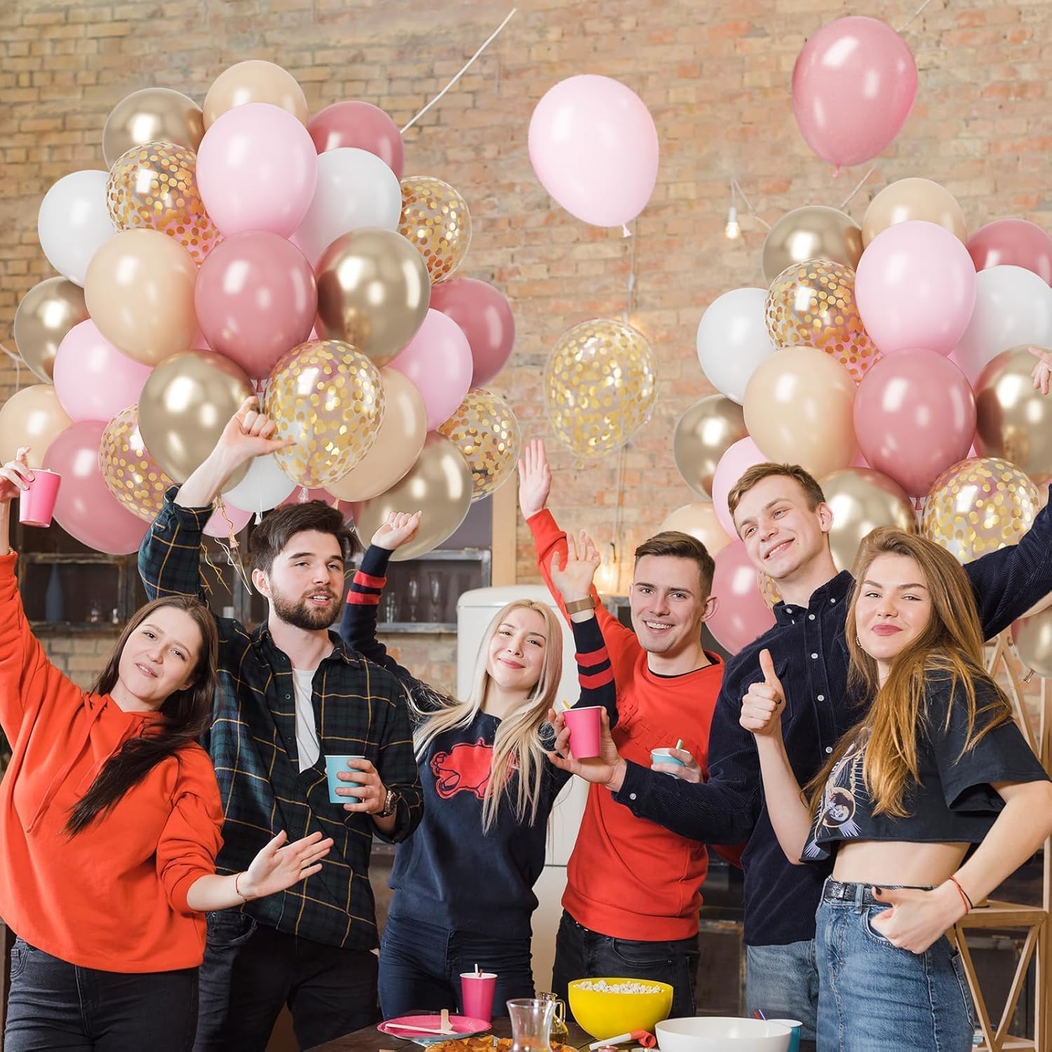 • 【WHAT YOU WILL GET】Our birthday party balloons include 50pcs blush pink balloons, designed to help you create stunning decoration: 10 x retro apricot balloons, 5 x white balloons, 5 x confetti gold ballons, 5 x metallic champagne gold, 10 x light pink balloons, 15 x retro dusty pink balloons, 1 x gold ribbon, and 1 x white ribbon. The size of the balloon is about 12 inches after inflation. The combination of pink and champagne gold can make party or occasion more classy.