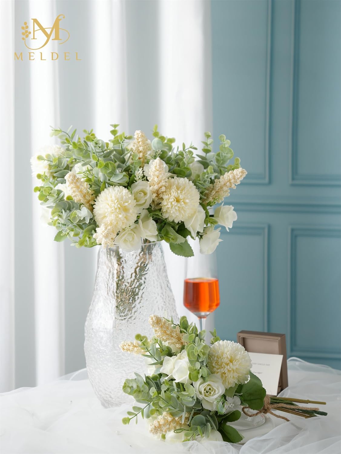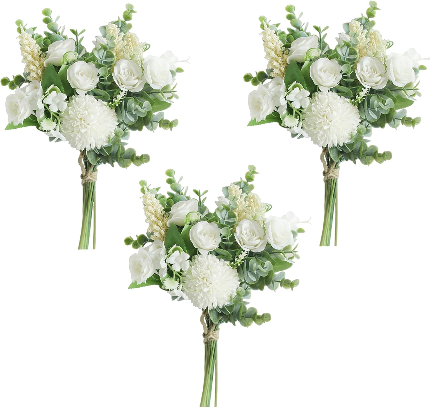 Meldel 3Pcs Rose Bouquet Artificial Fake Flowers Eucalyptus Plants Silk Flower Arrangements Wedding Bouquets Decorations Plastic Floral Table Centerpieces for Home Kitchen Garden Party Decor (White)